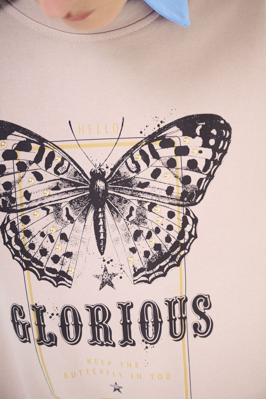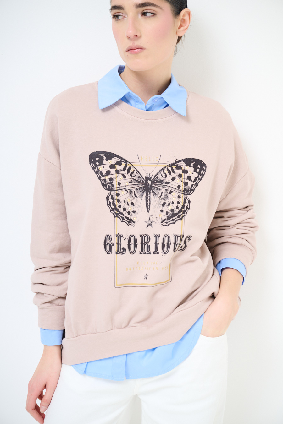 Felpa oversize garzata, con spalla calata e girocollo. Stampa con applicazioni farfalla sul fronte