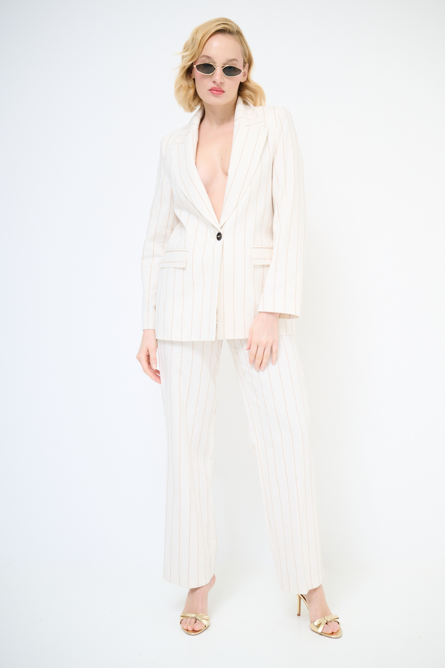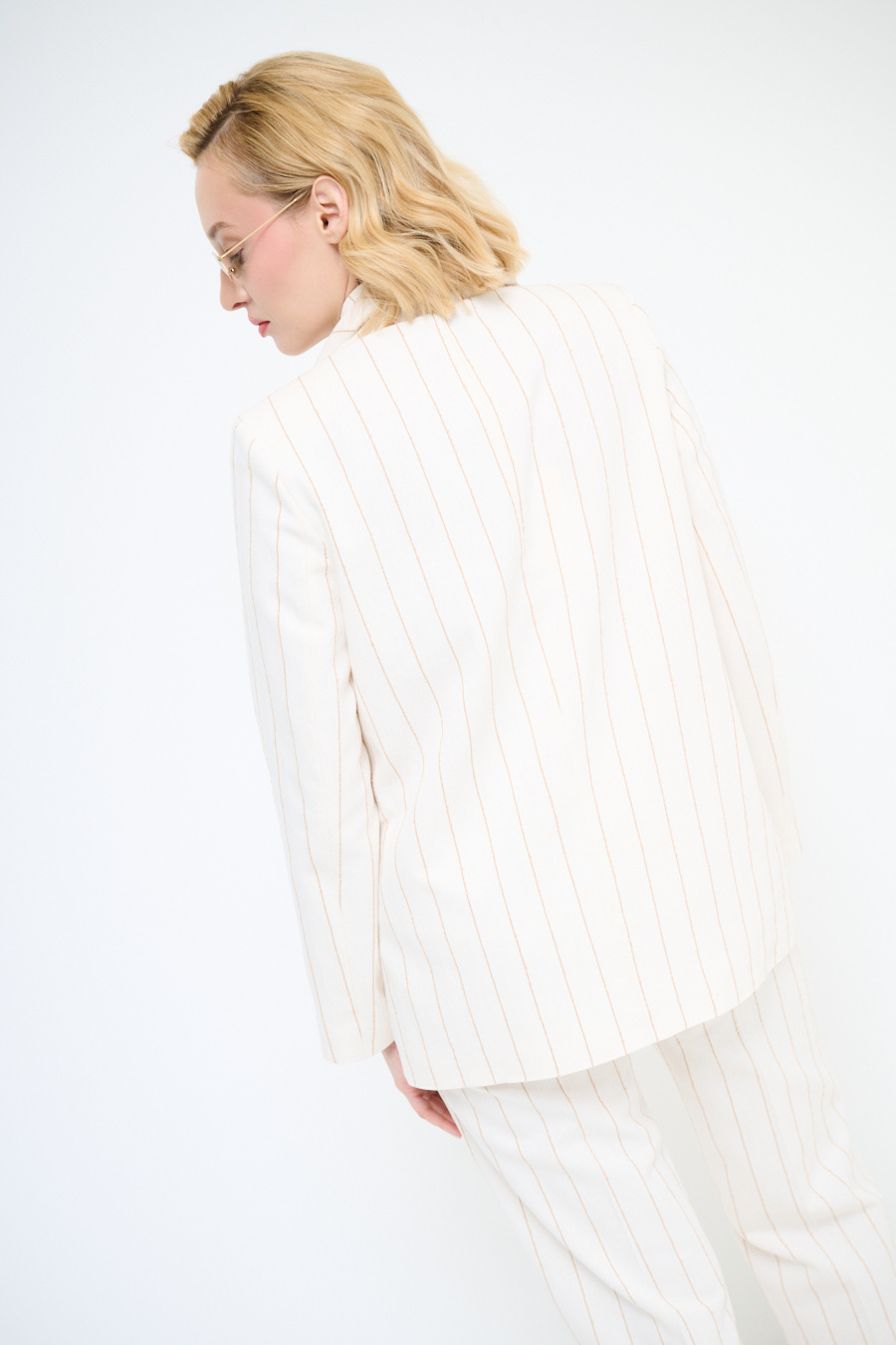 Giacca a righe a un bottone con pattine finte tasche, spalline imbottite. Giacca foderata internamente