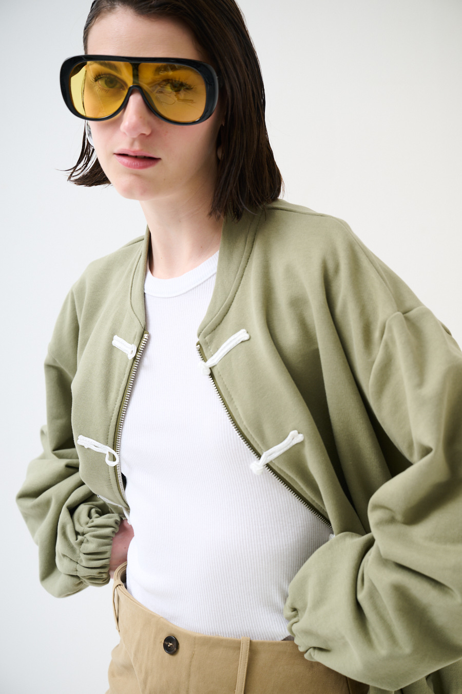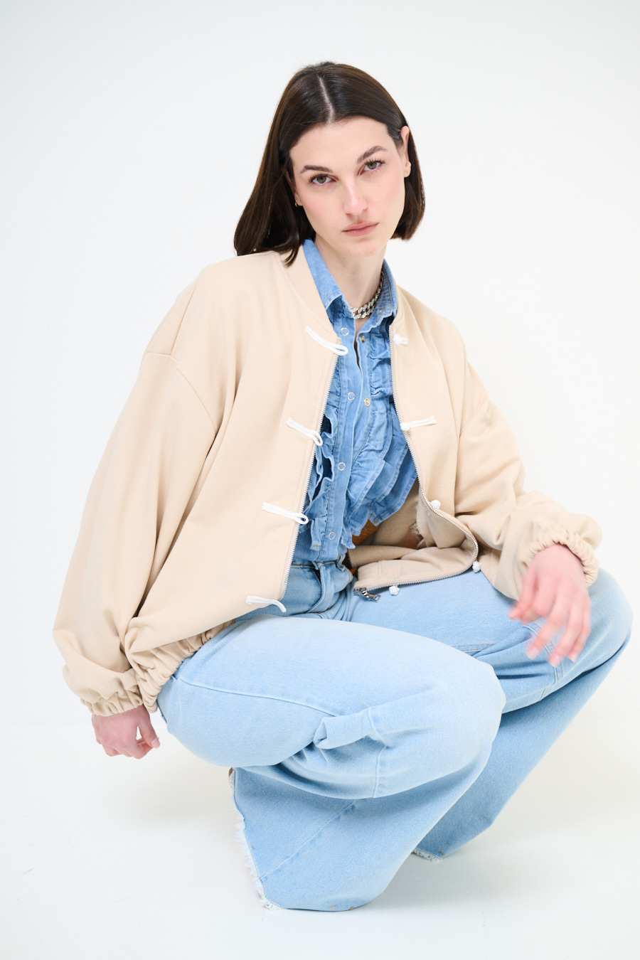 Giacca in felpa garzata con collo a coreana, spalla calata. Chiusura con zip centrale e alamari, elasticizzata sul fondo e su polsini