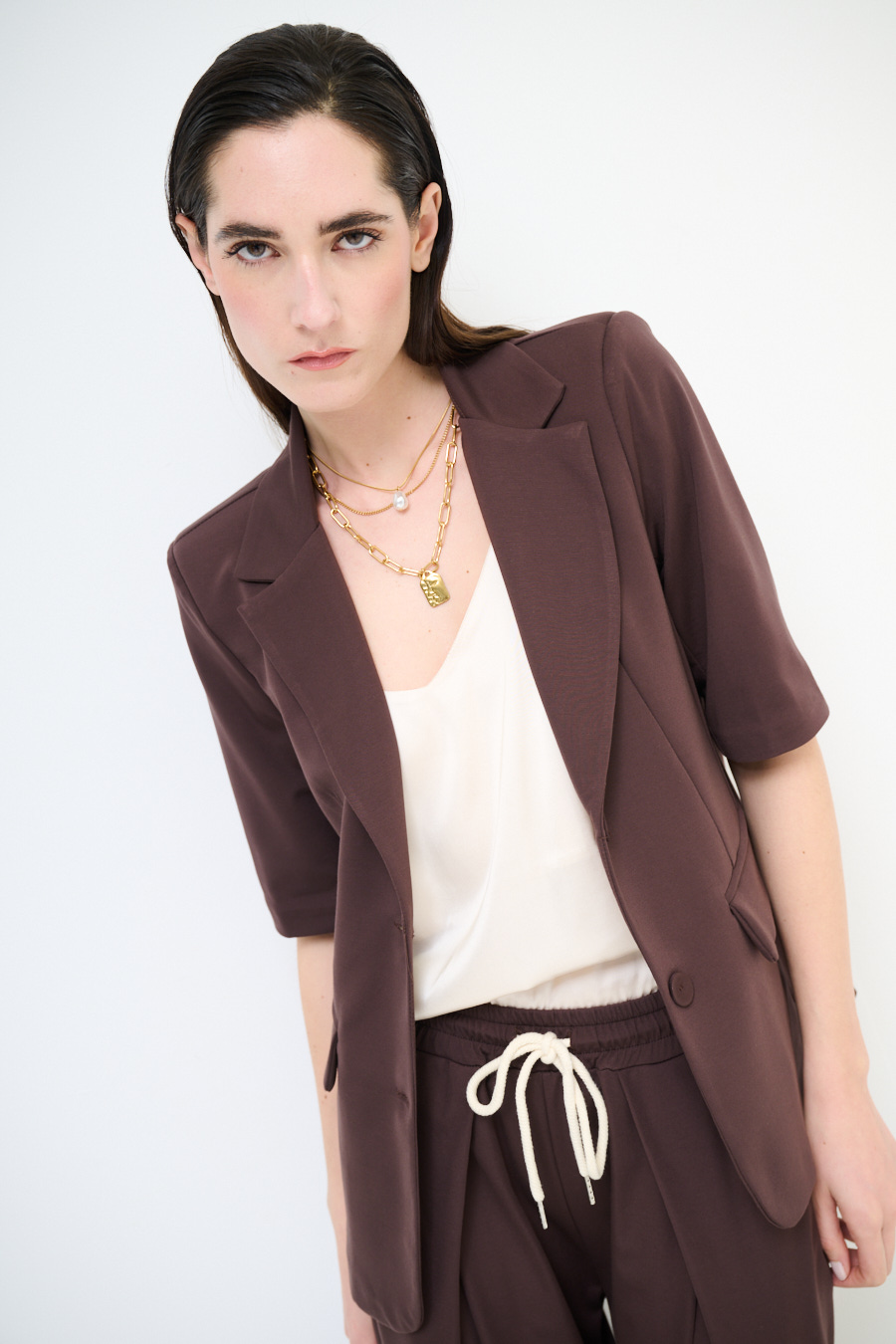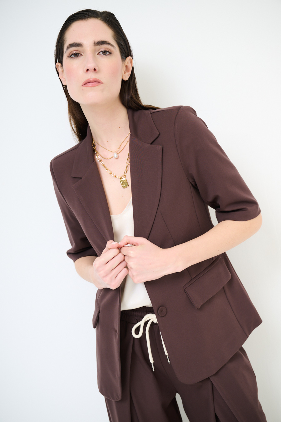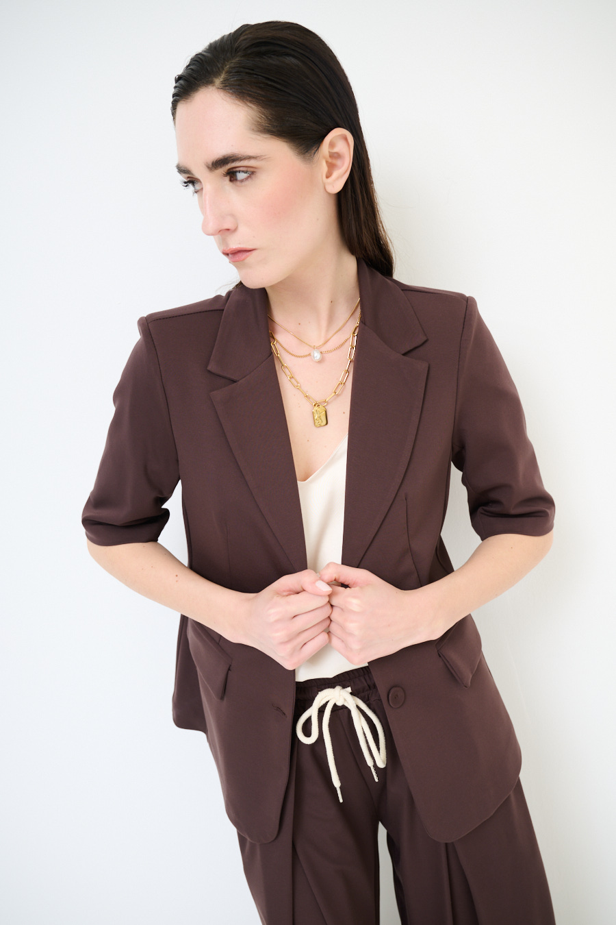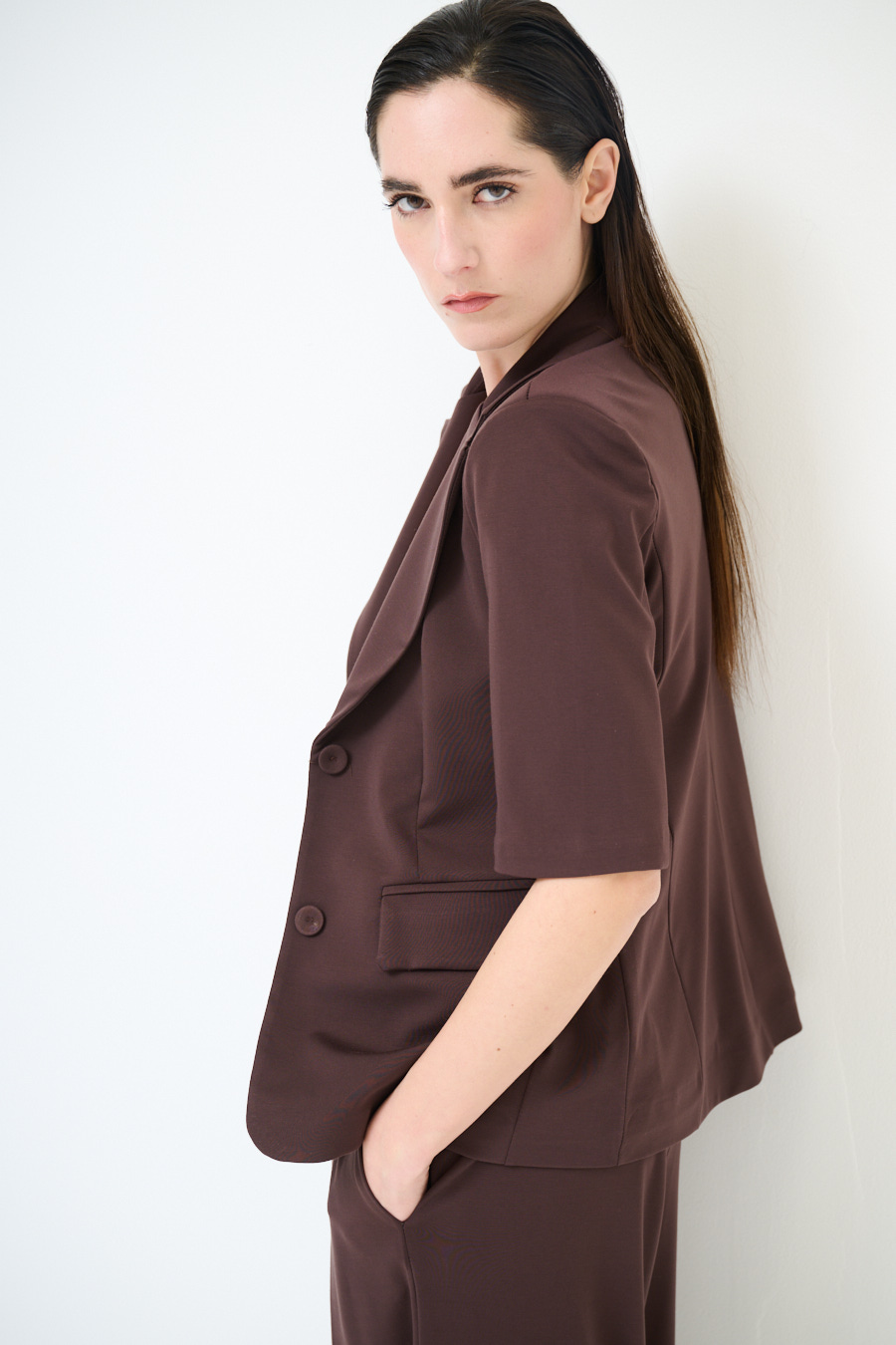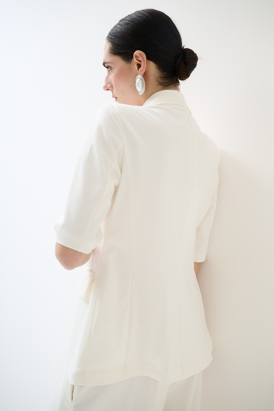 Giacca in punto milano leggera con manica corta, chiusura a due bottoni, spalline imbottite e tasche a pattina, foderata internamente
