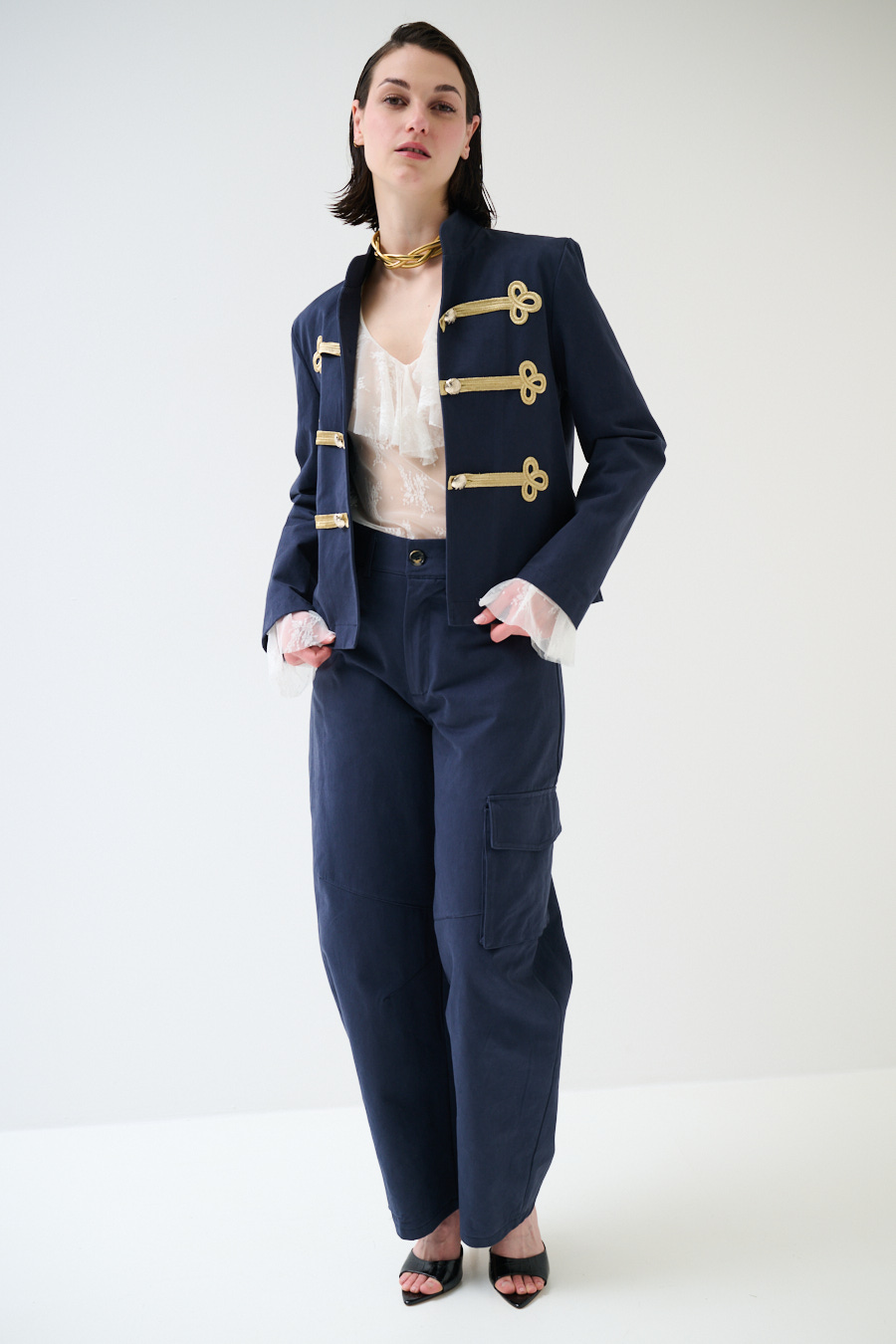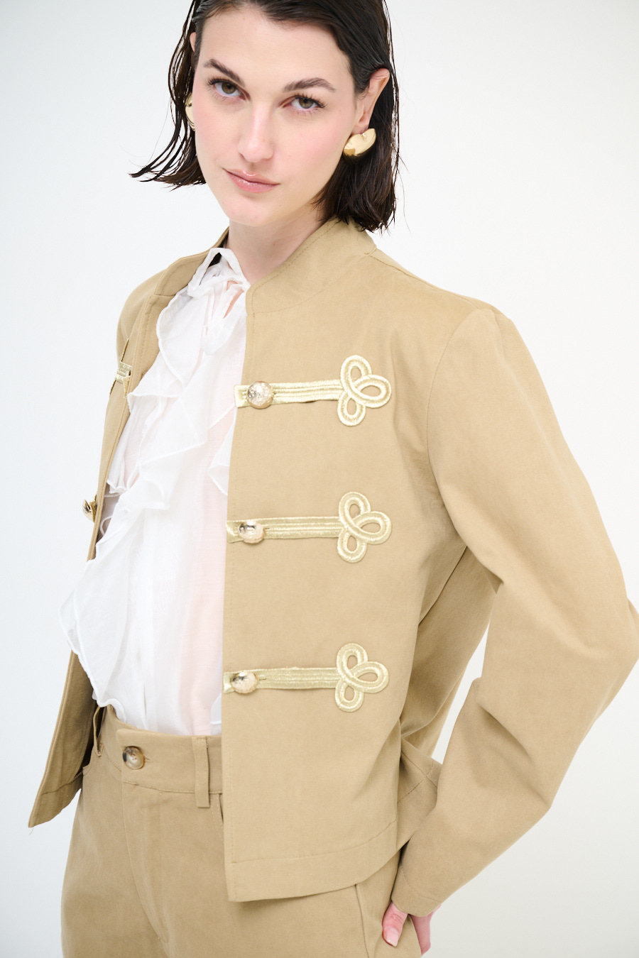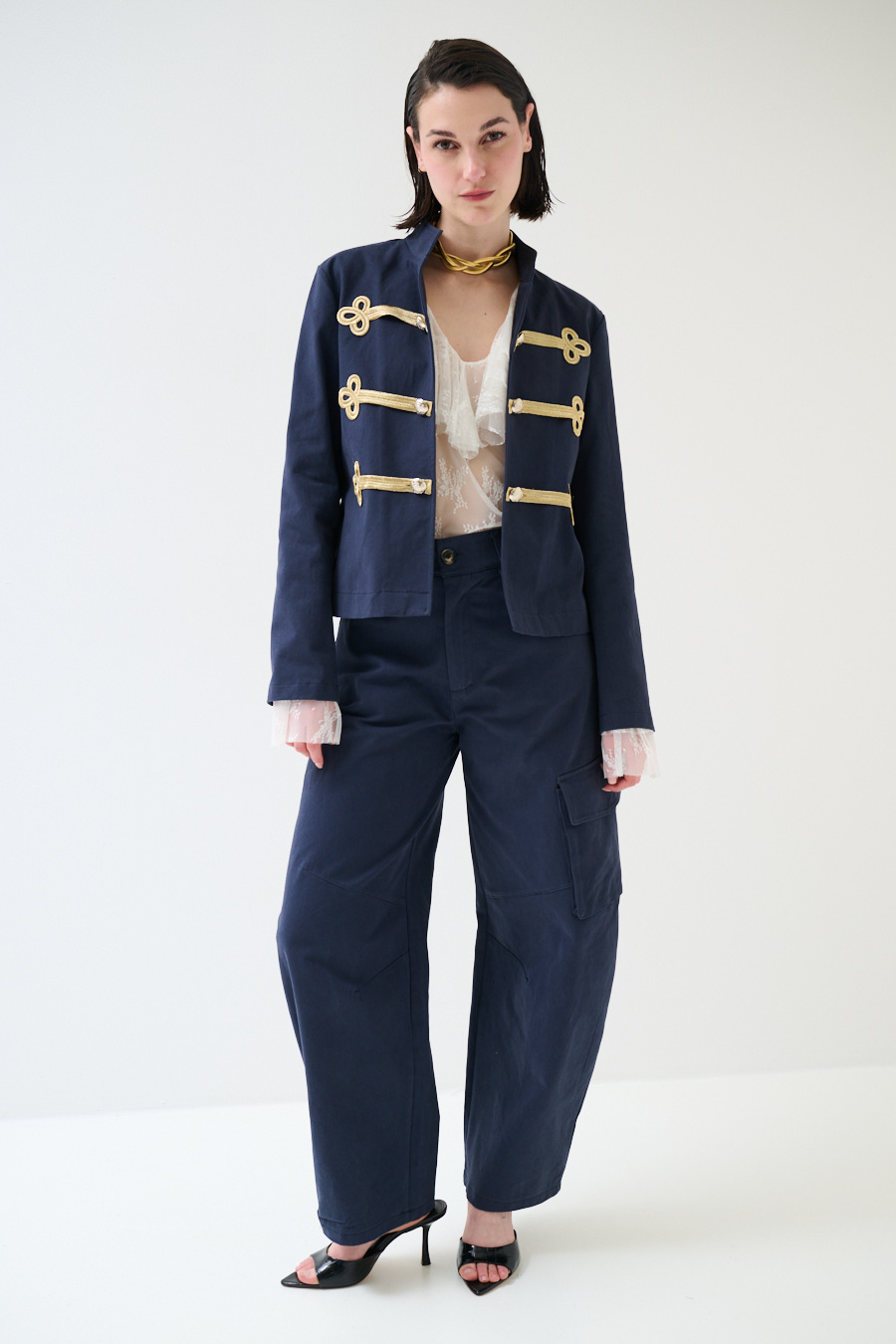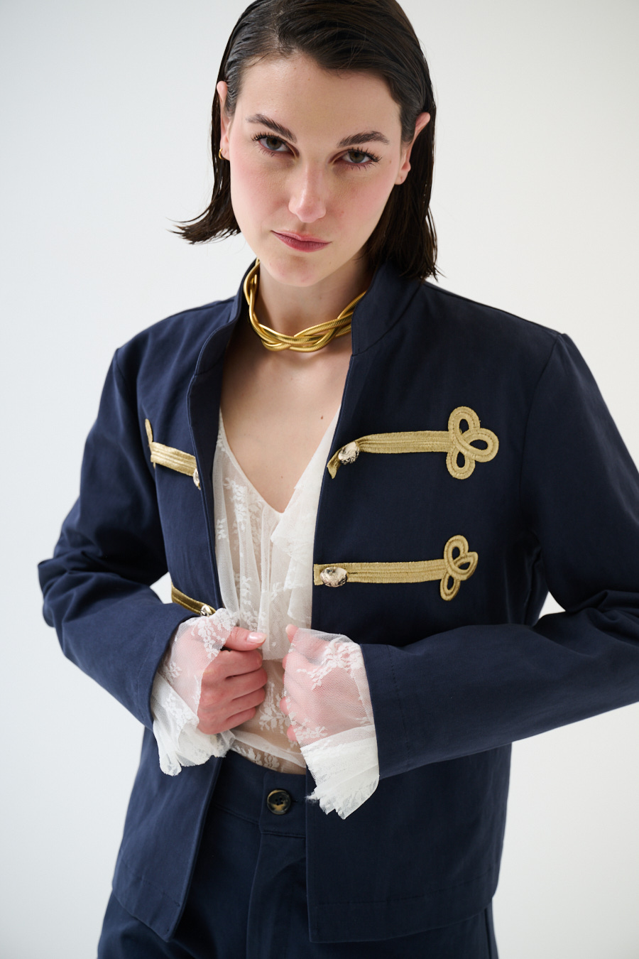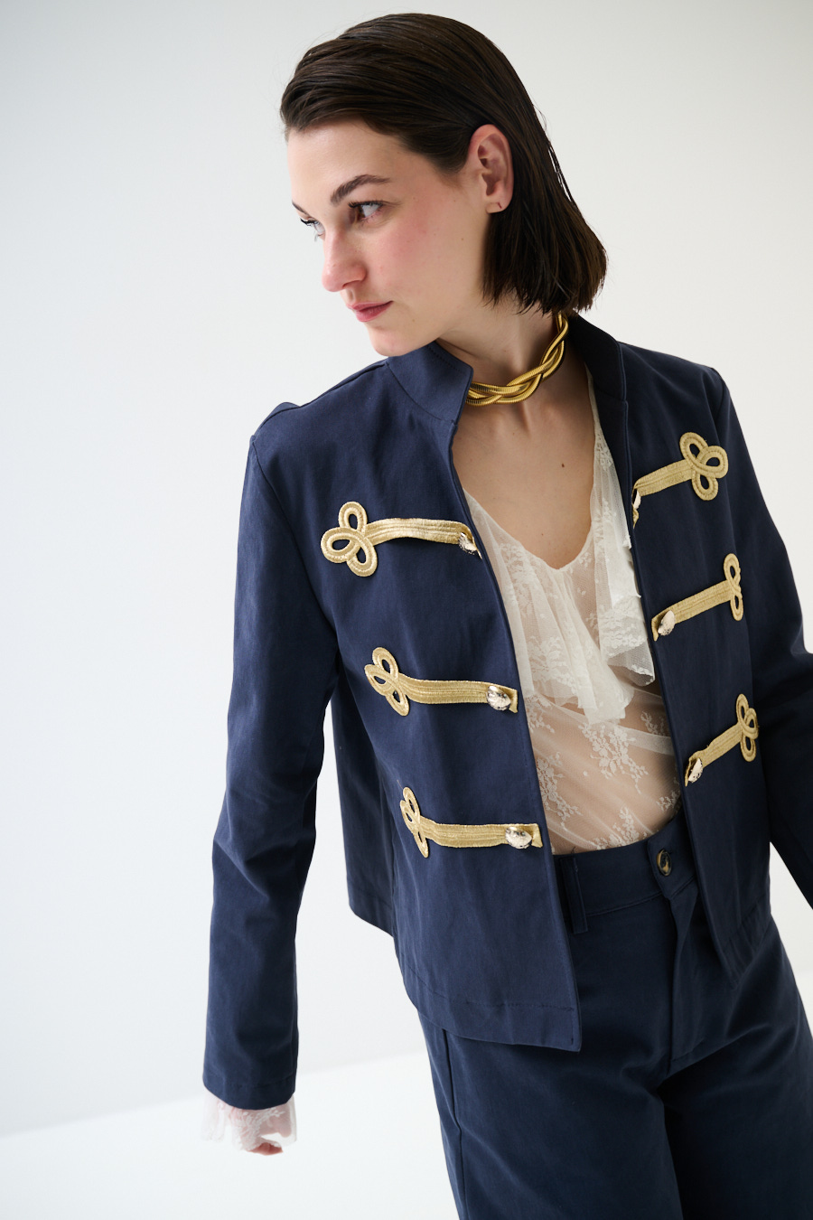Giacca napoleonica corta con colletto a coreana e alamari dorati frontali