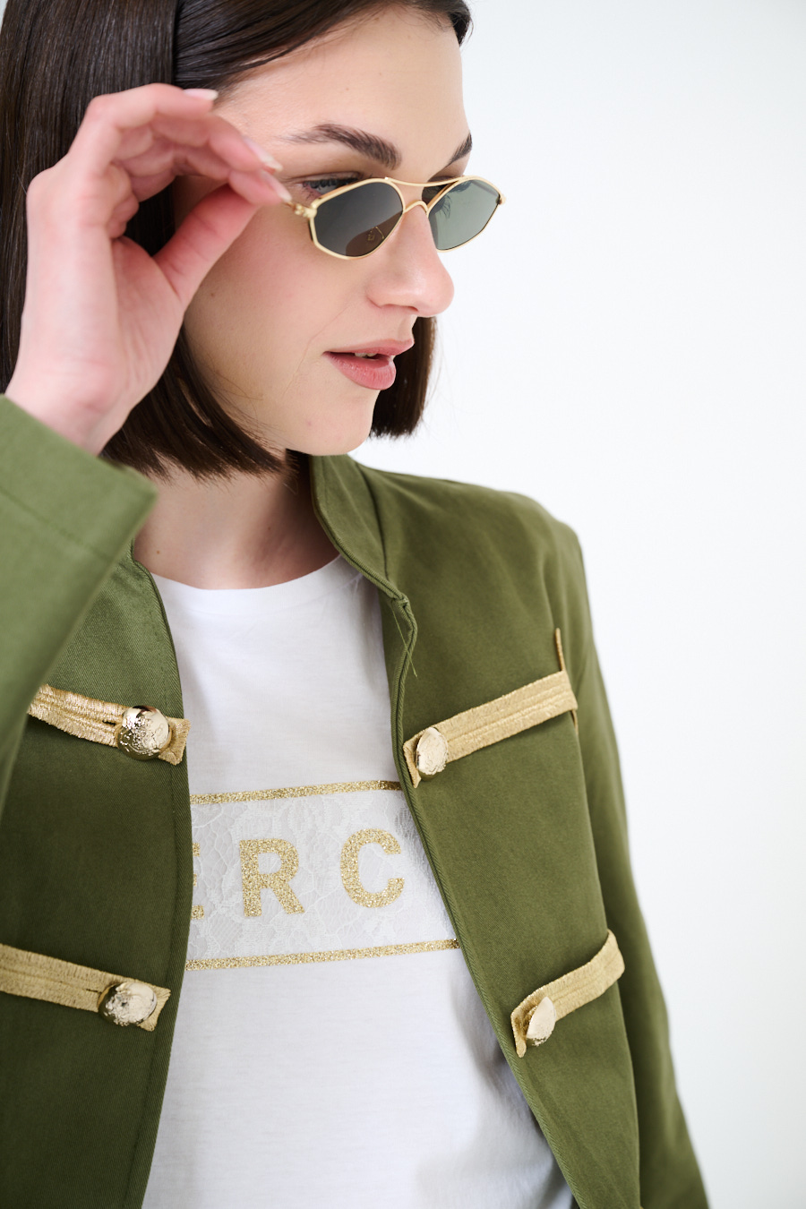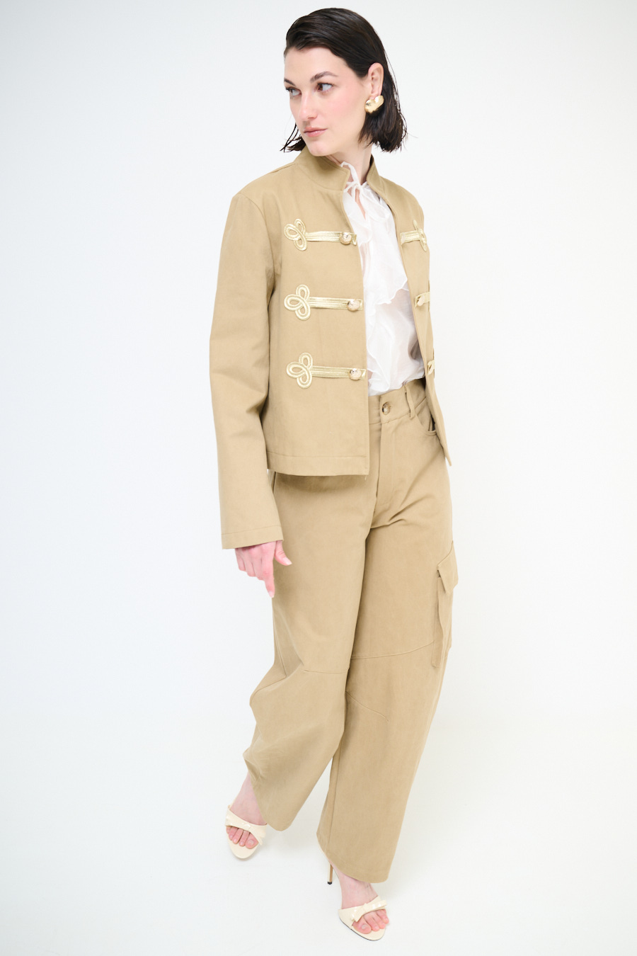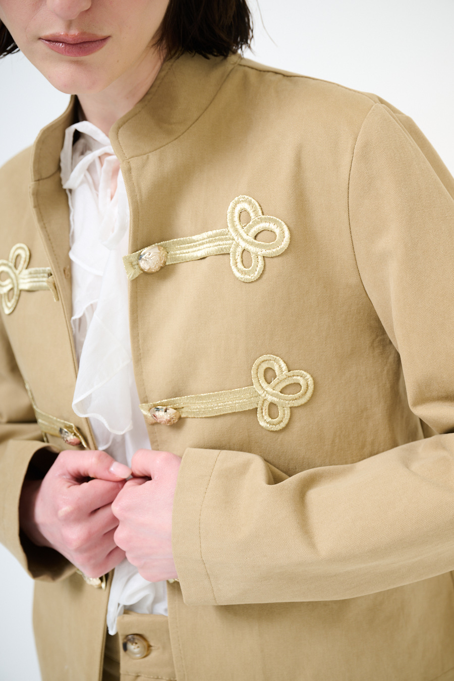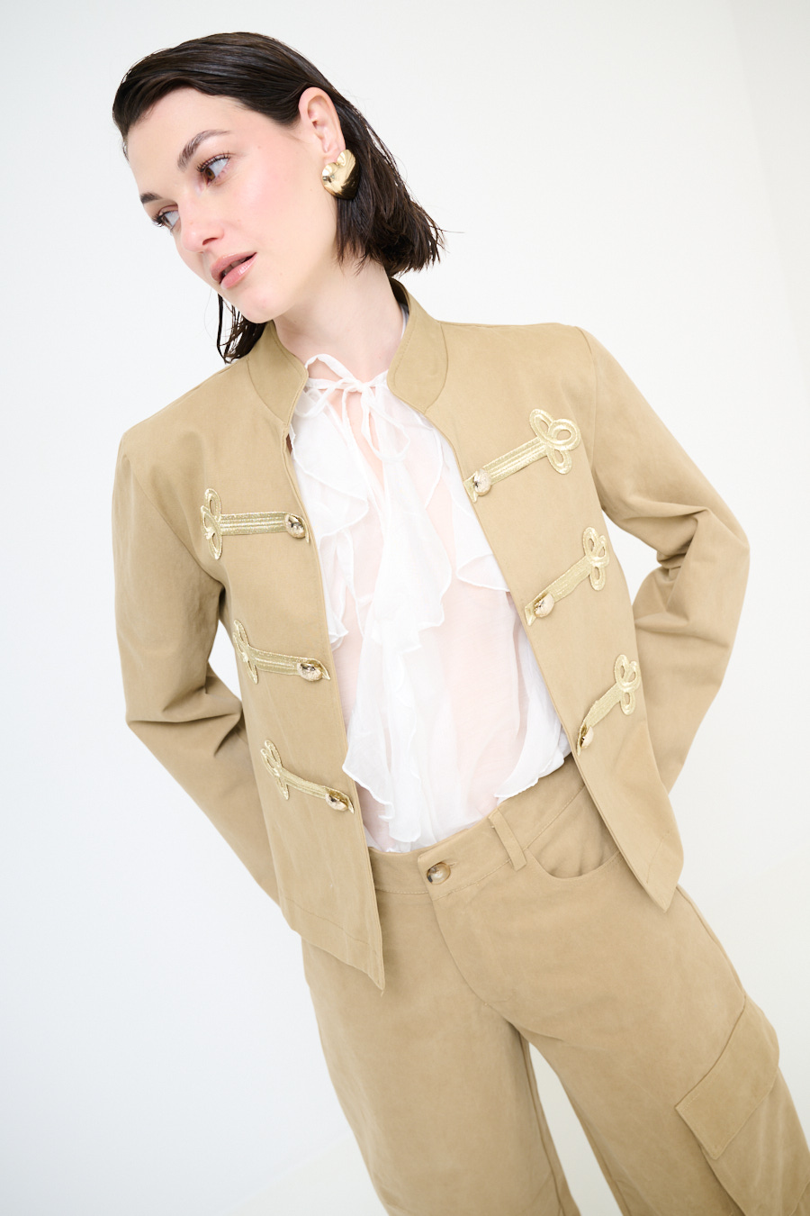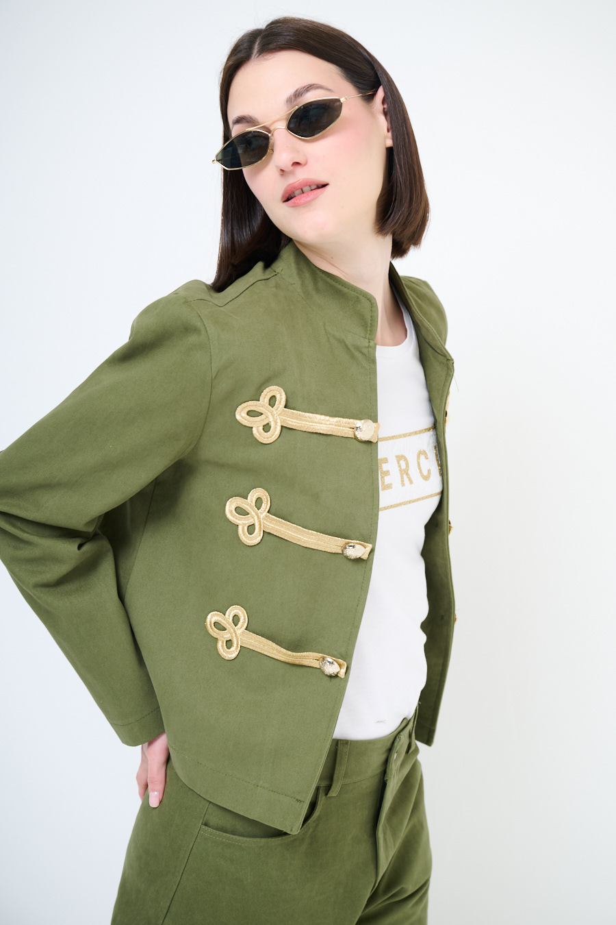 Giacca napoleonica corta con colletto a coreana e alamari dorati frontali
