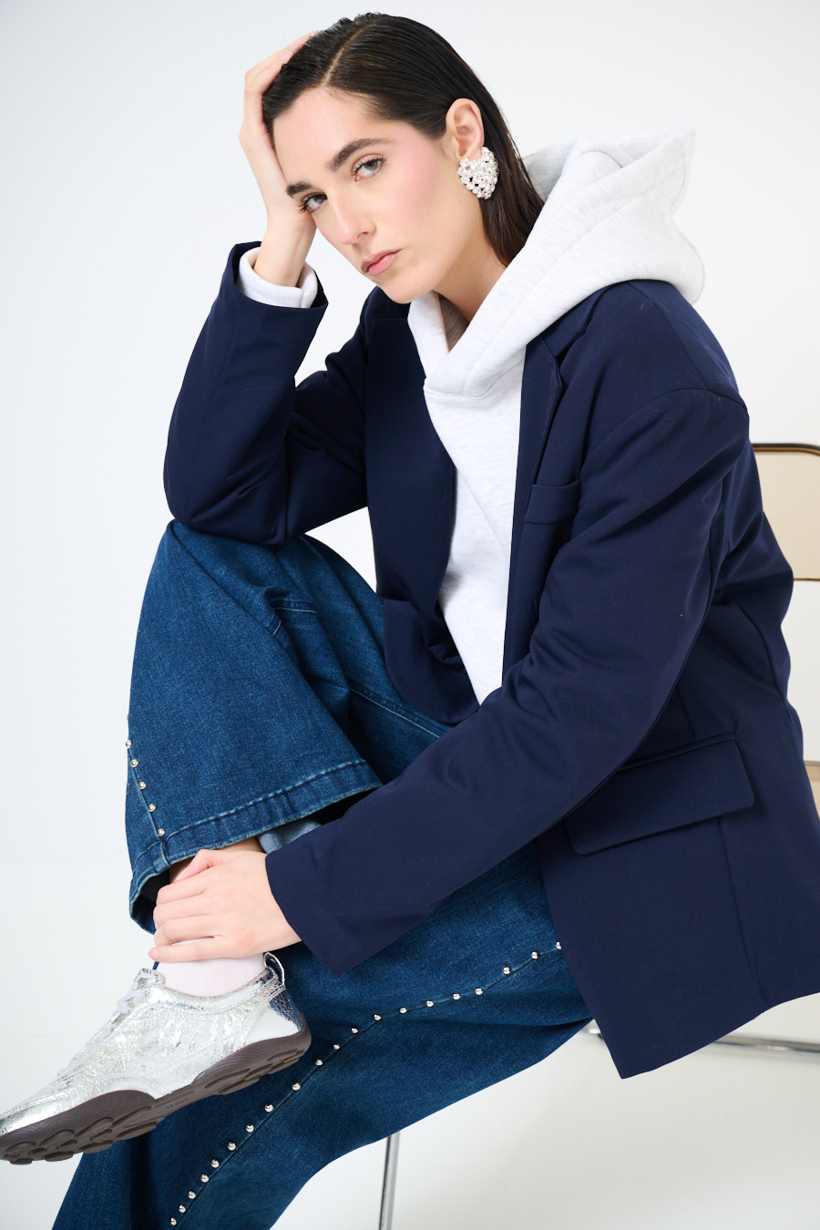 Giacca over monopetto a un bottone con pattine frontali. Collo rever ampio e spalline imbottite , con fodera interna