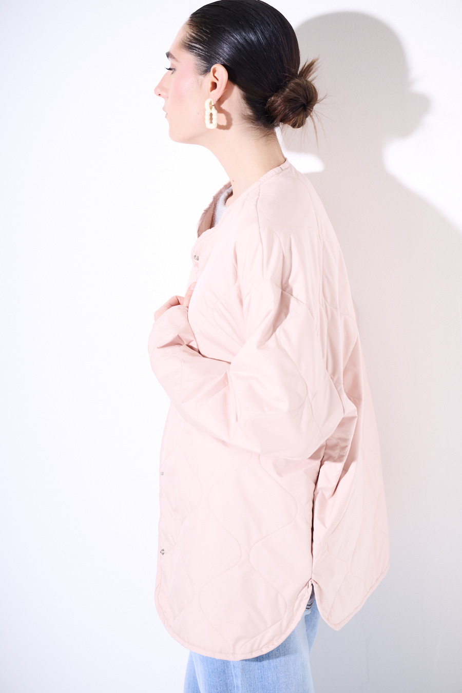 Giacca trapuntata senza imbottitura con abbottonatura centrale con bottoni a pressione. Con girocollo, stondato sul fondo e spalla calata