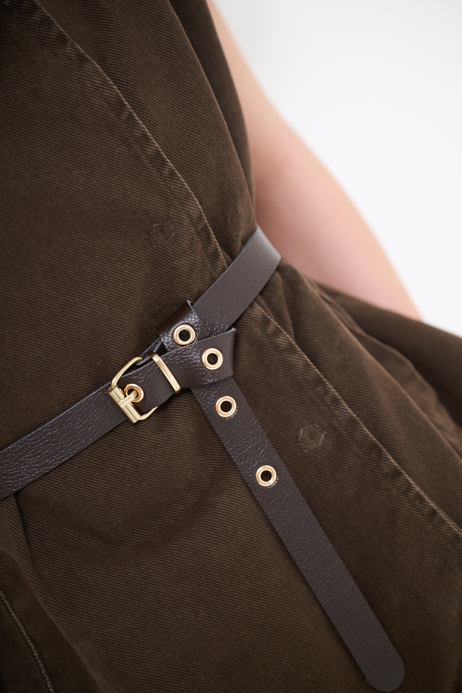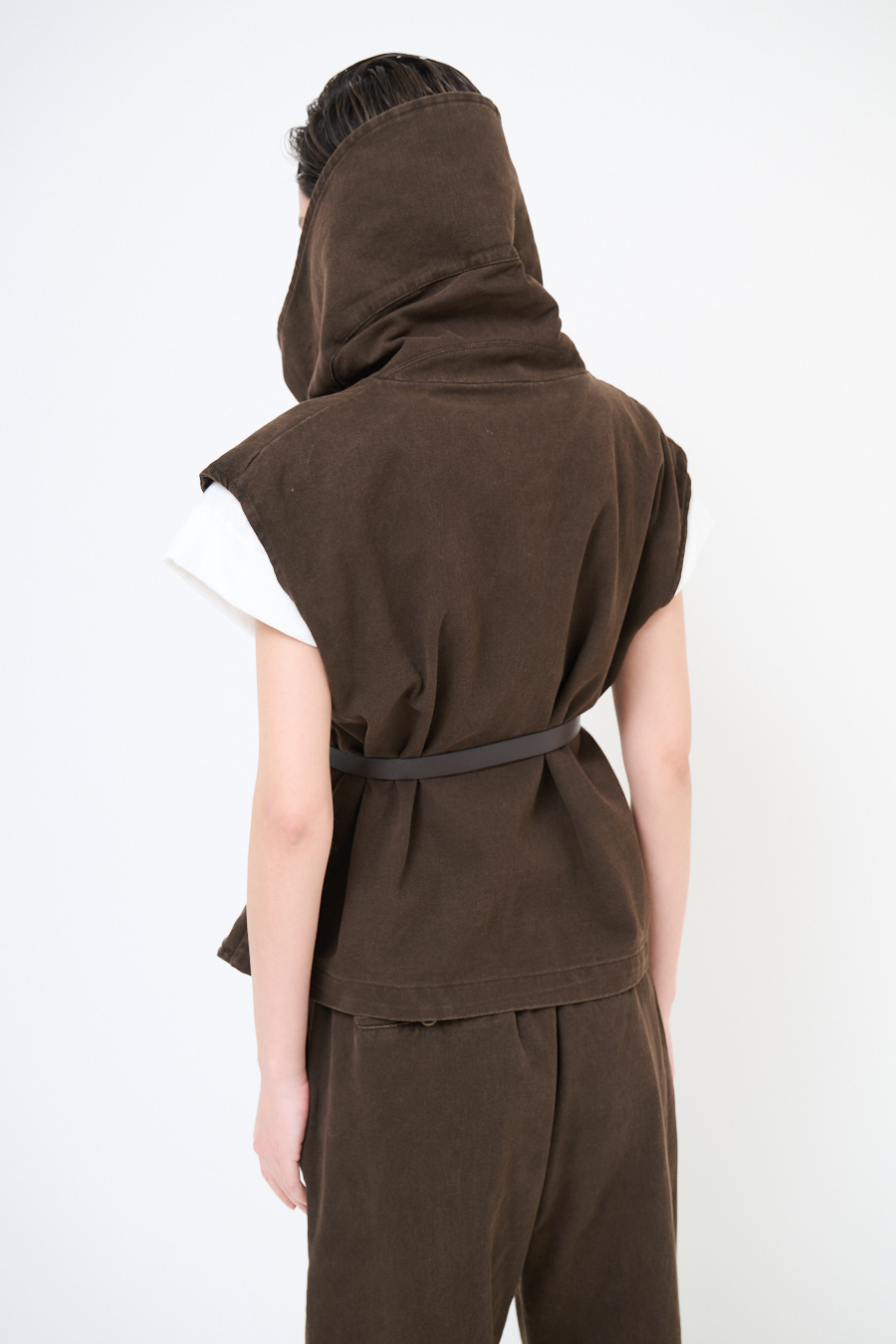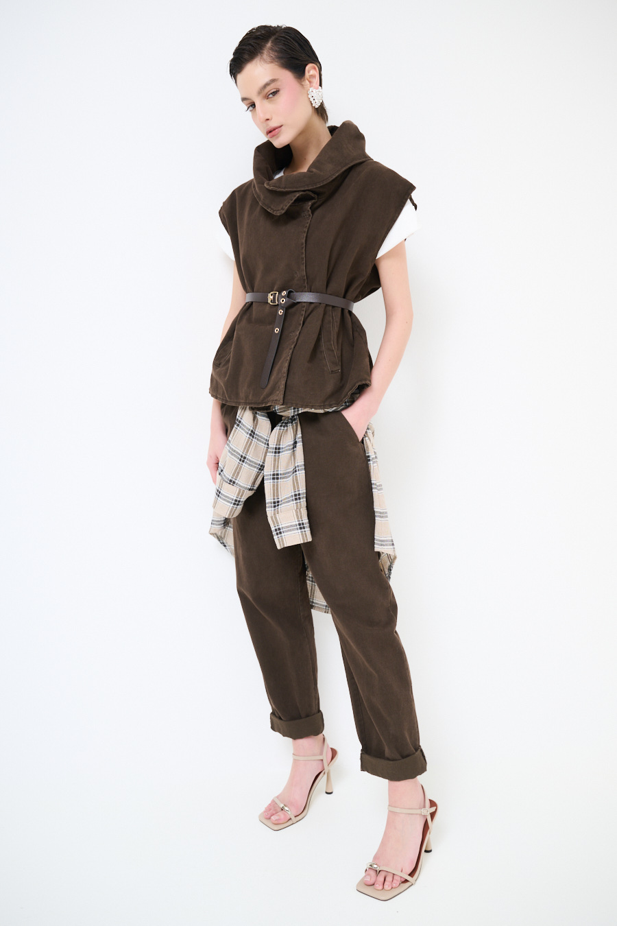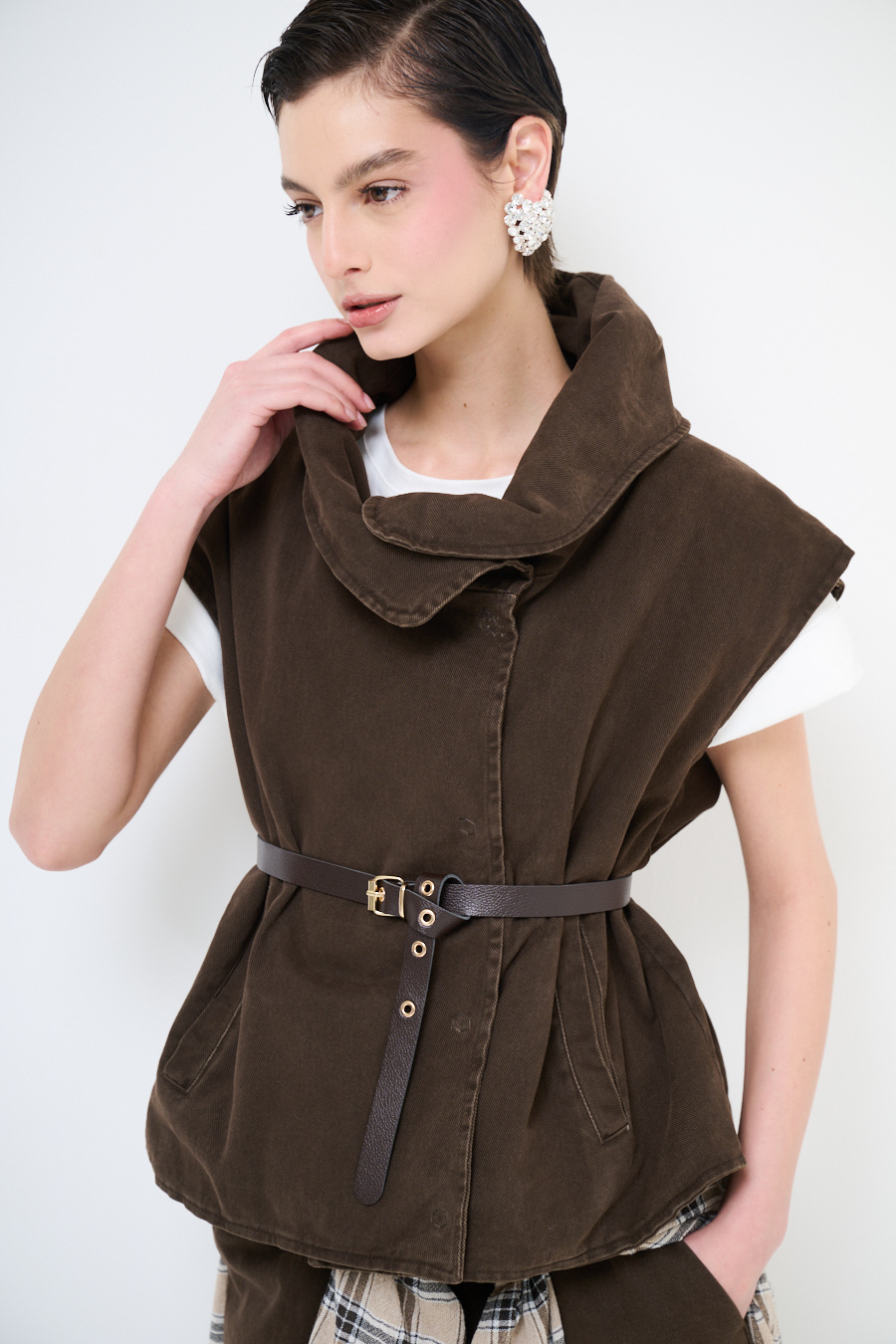 Gilet in gabardina con mezzo collo ampio, chiusura con bottoni a pressione e cintura in vita