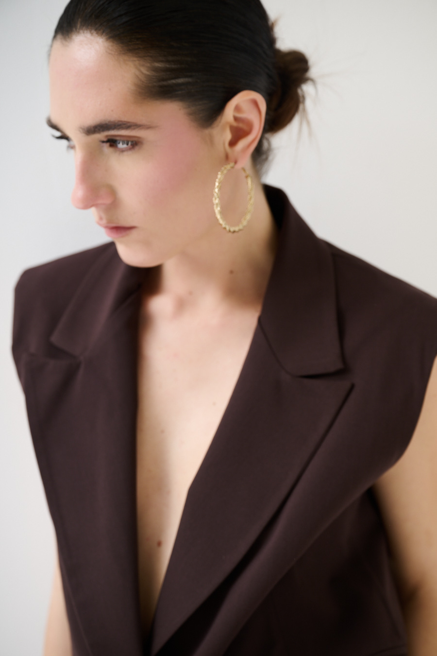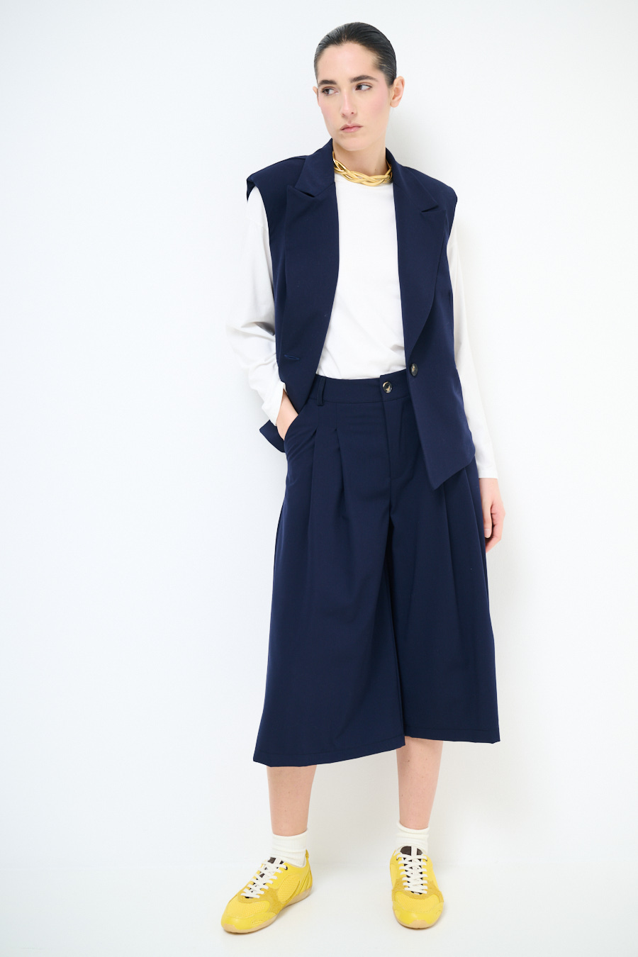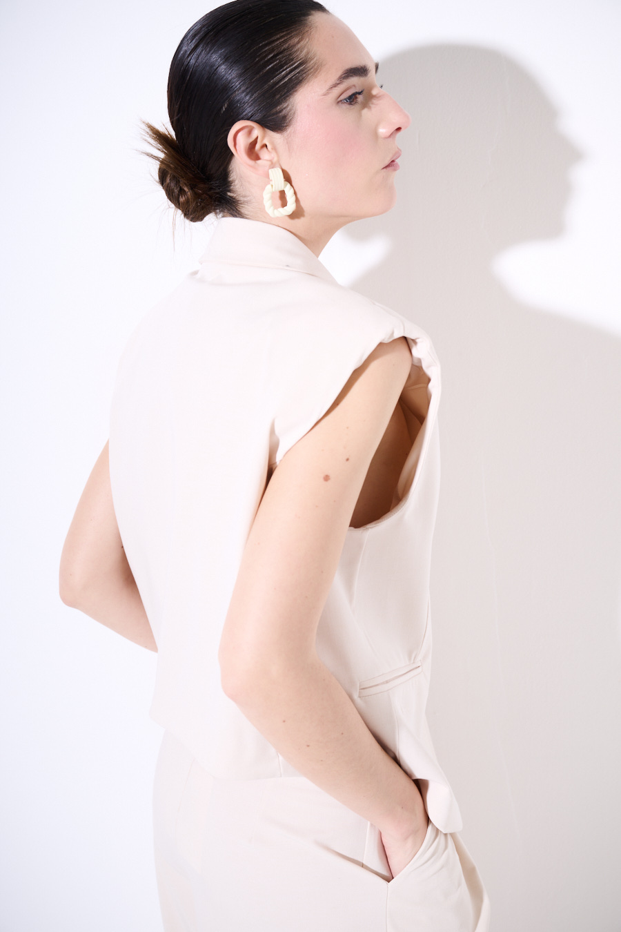 Gilet crop a un bottone, con spalline imbottite, finte tasche a filetto, foderato internamente e più corto sul retro