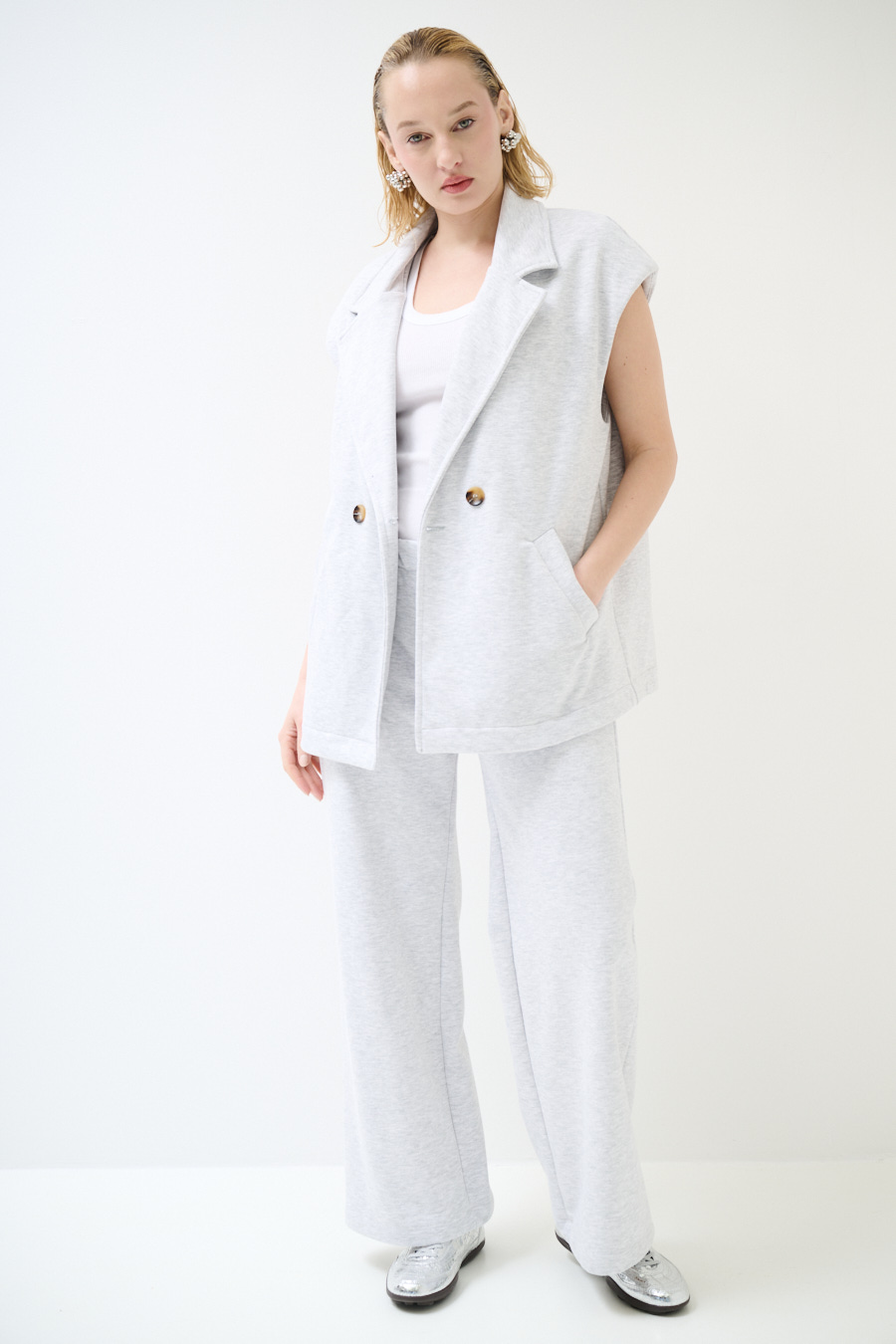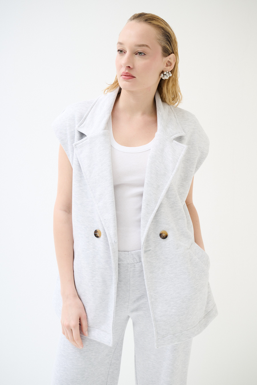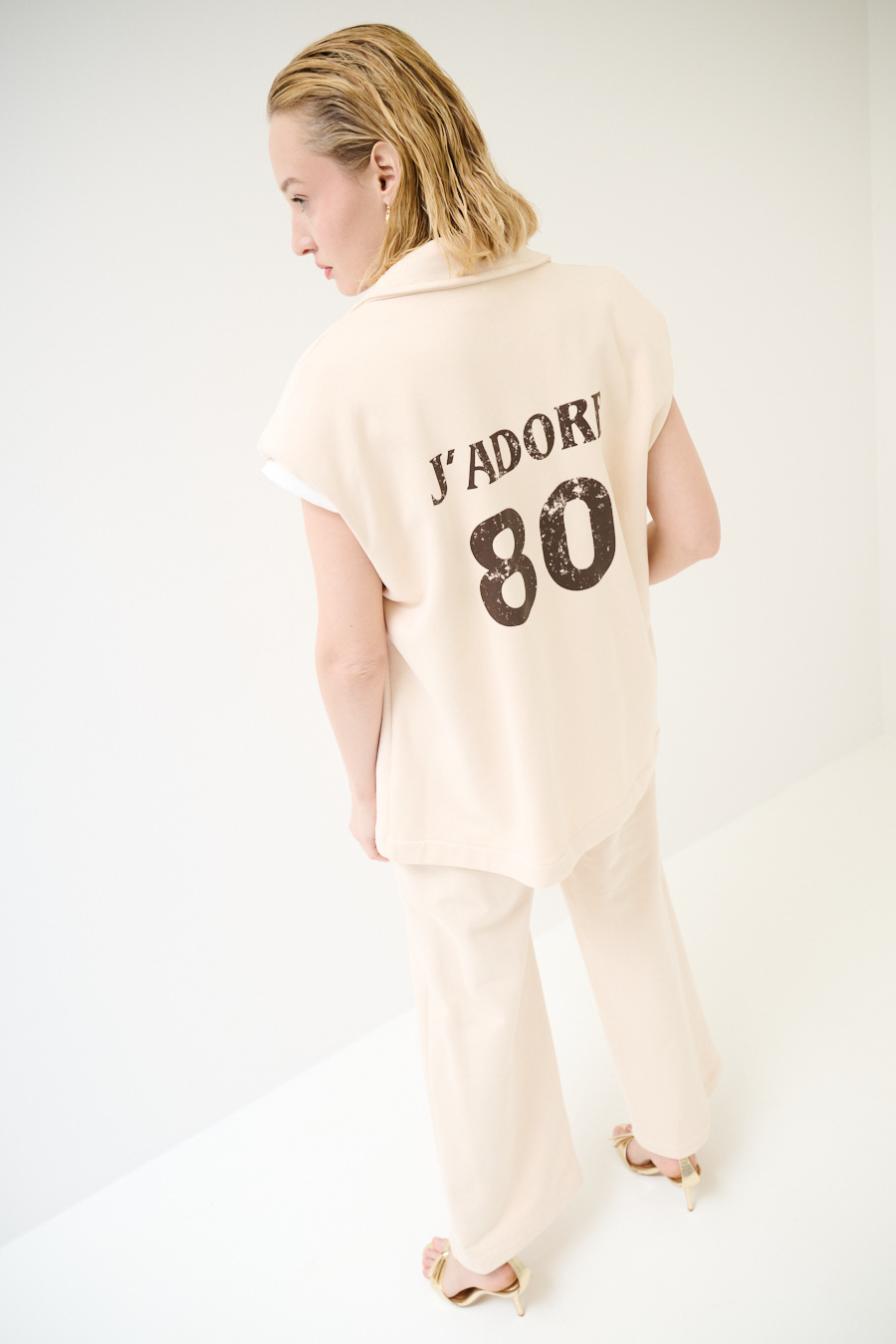 Oversized double-breasted brushed sweatshirt vest with slanted pockets and padded shoulders. With vintage 'J'adore' print on the back