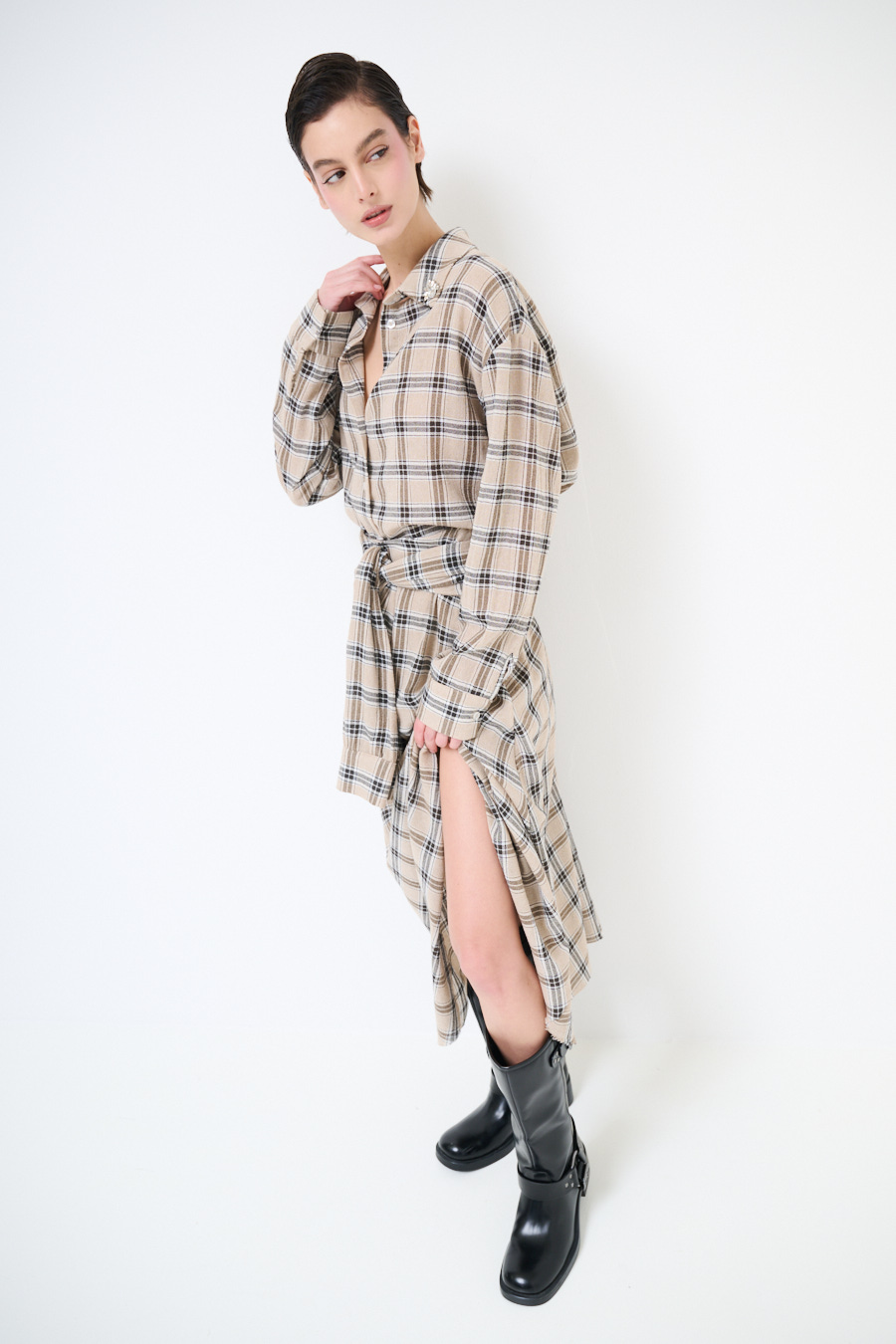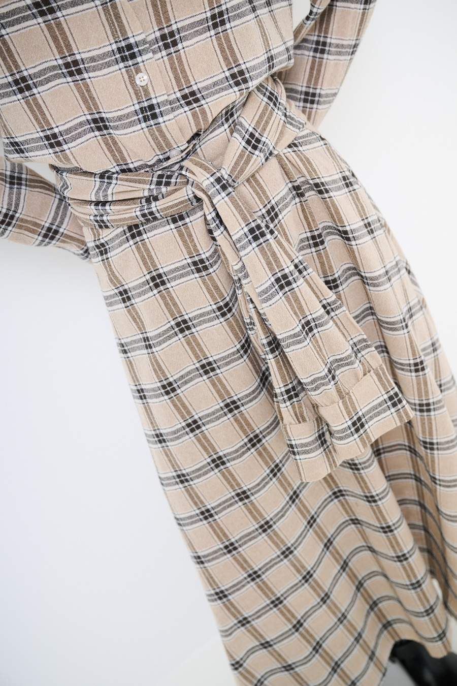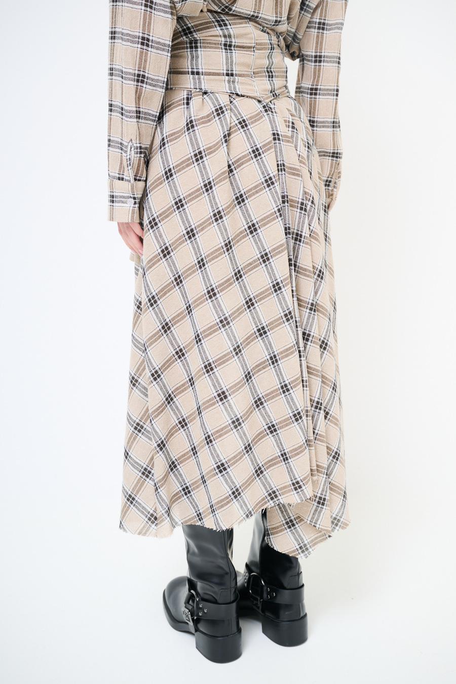Flared midi checked skirt with faux tied-sleeve detail at the waist, elasticated at the back of the waist