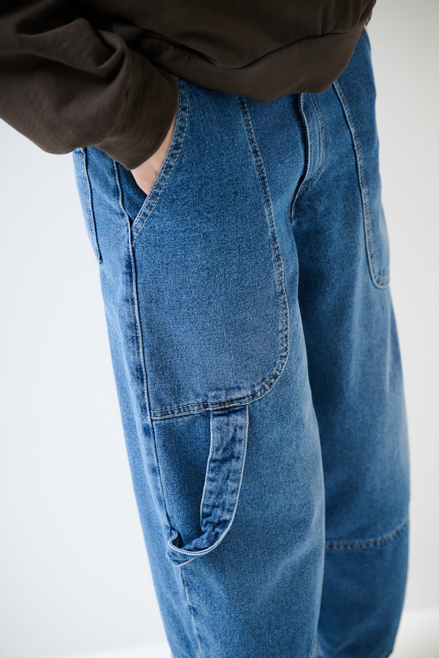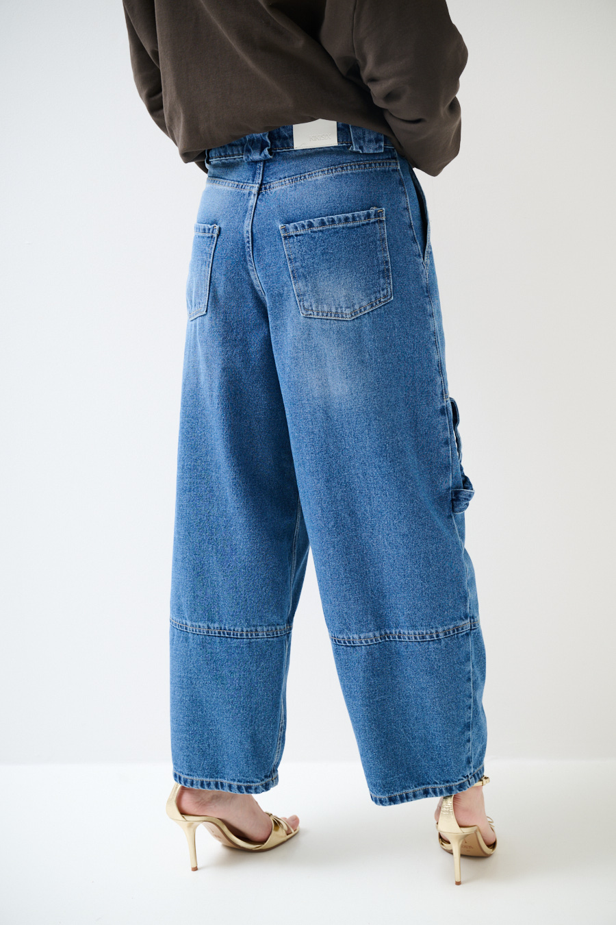 Jeans barrel con tasconi ampi davanti con cucitura a contrasto, con portamartello sulla gamba. Chiusura con zip e bottone e con salpa con logo impresso sul retro