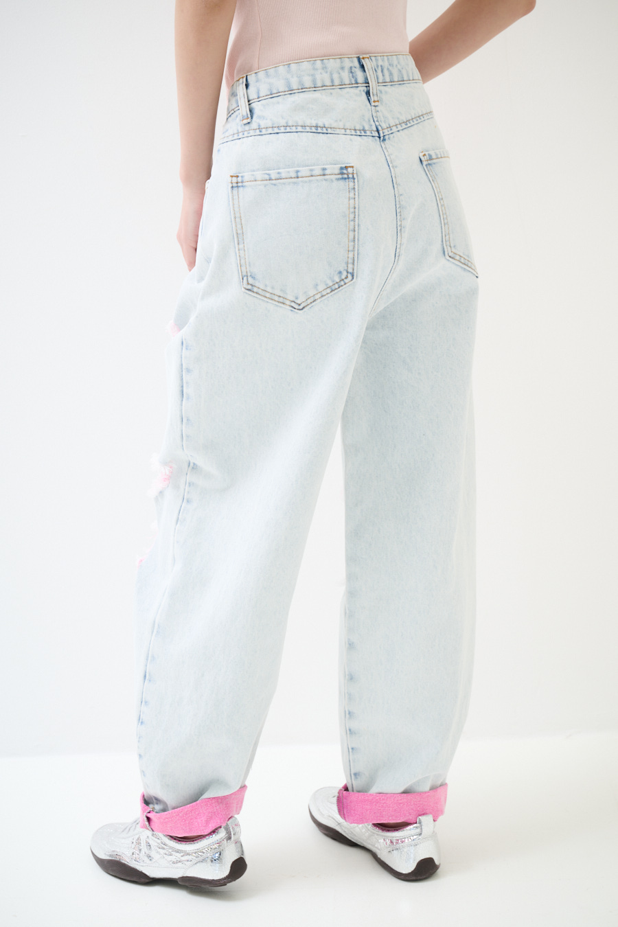 JEANS MARMORIZZATO CON STRAPPI E INTERNO FLUO ROSA