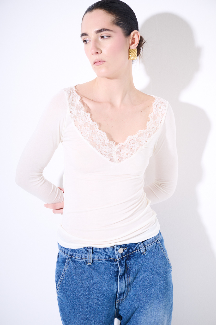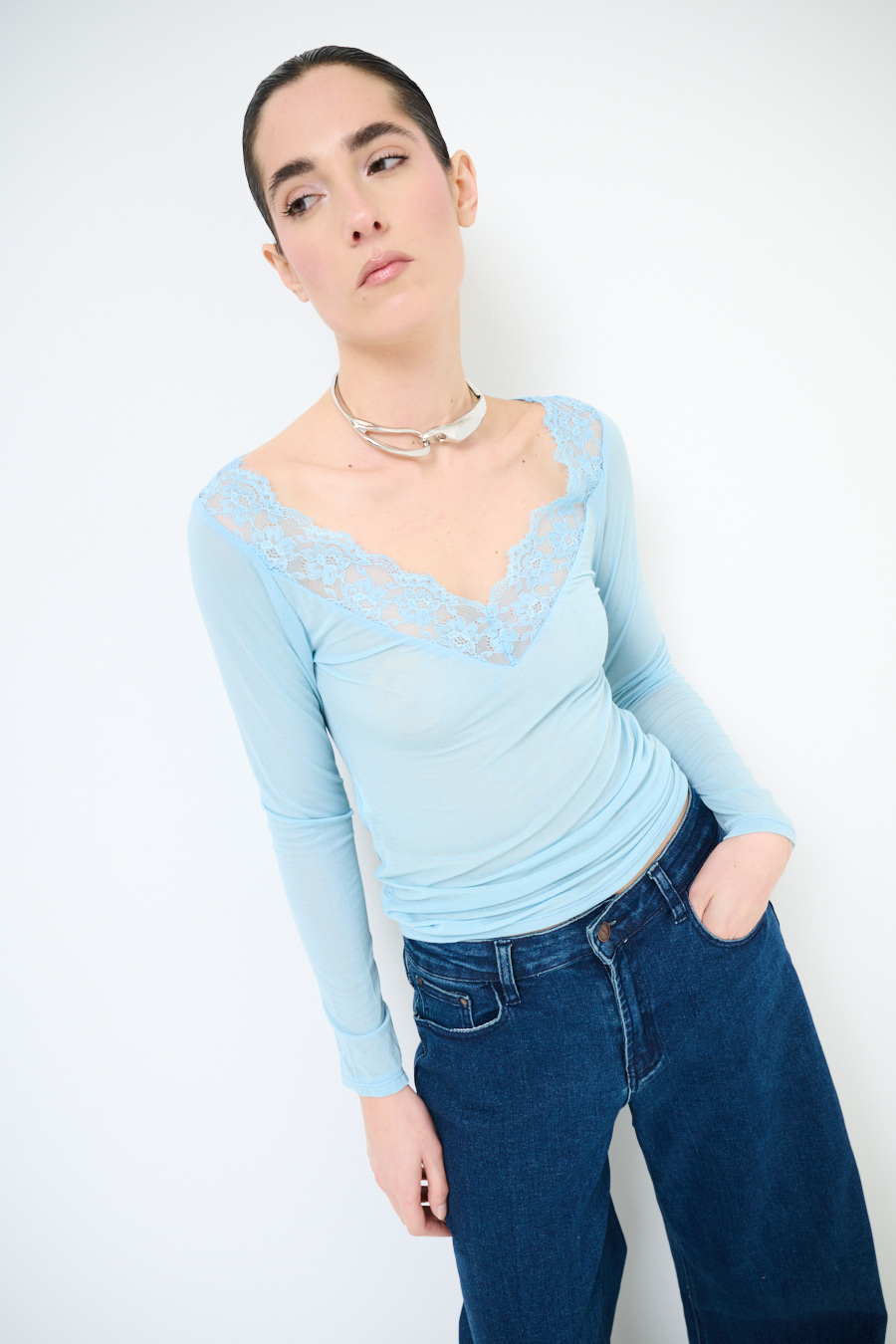 Maglia basic semitrasparente con scollo a v con inserto in pizzo