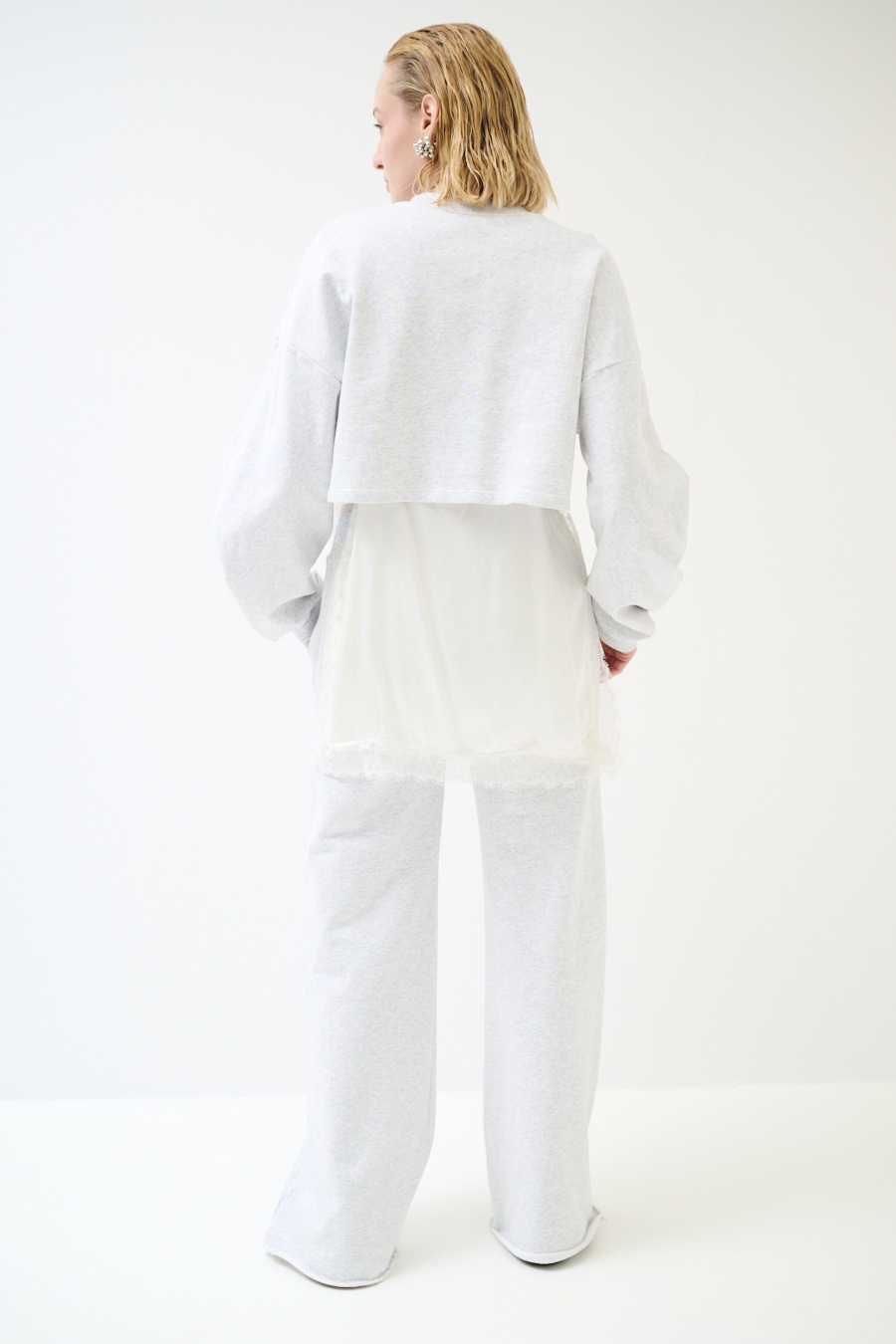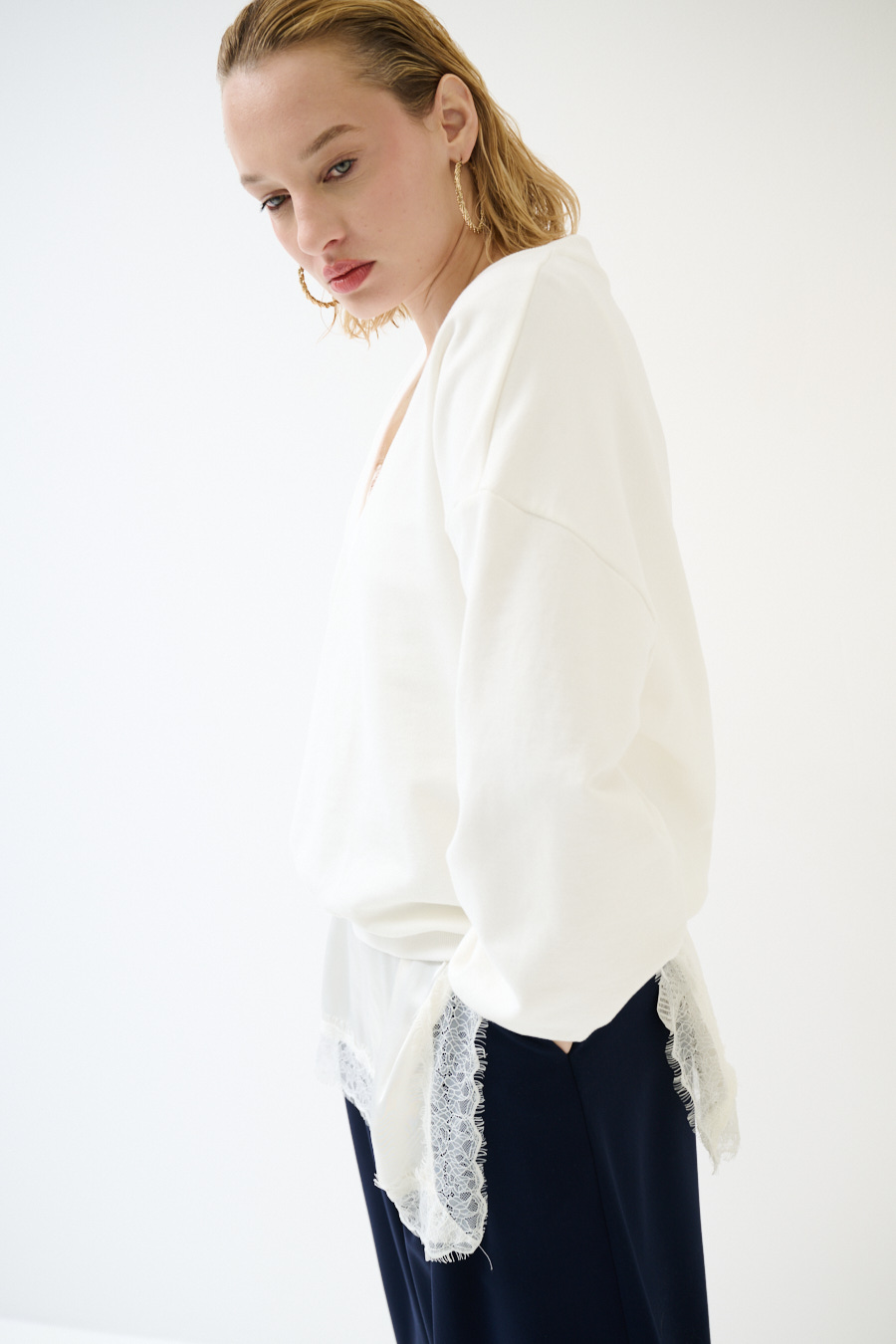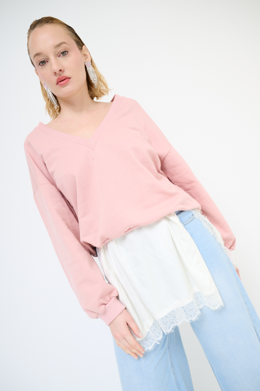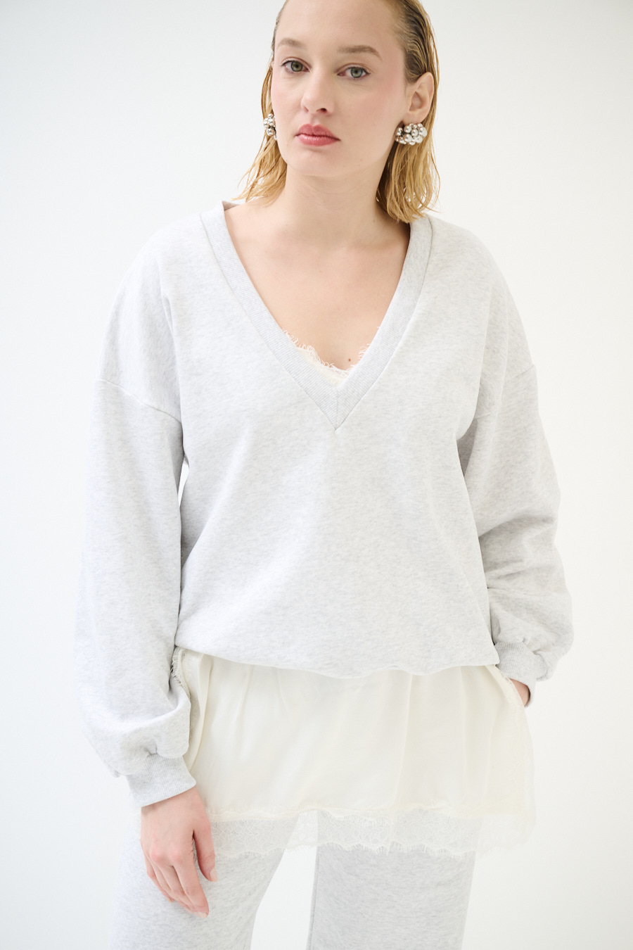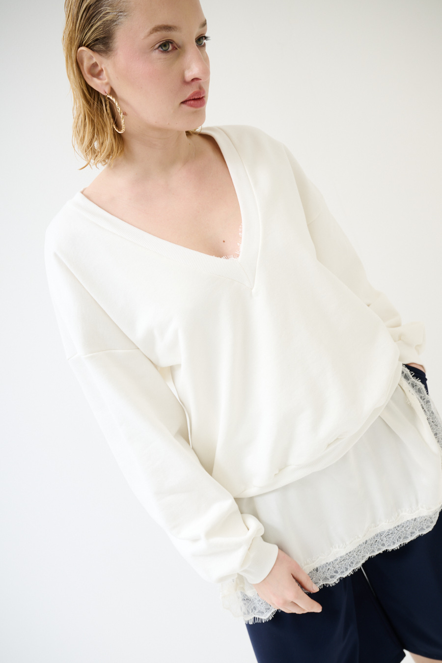 Maxi felpa garzata con scollo a v con spalla calata e manica lunga, con mini abito sottoveste in raso con profili in pizzo color panna