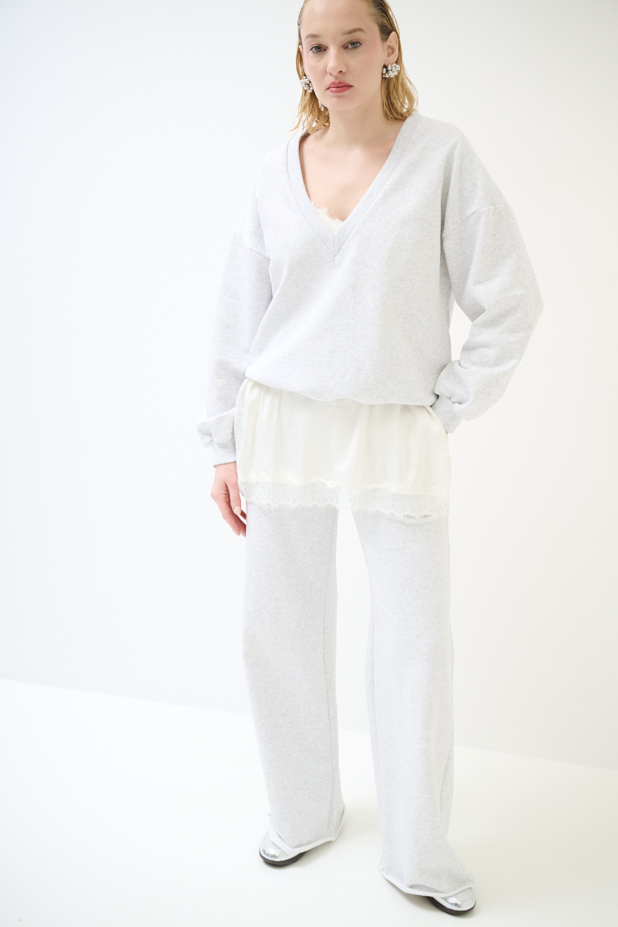 Maxi felpa garzata con scollo a v con spalla calata e manica lunga, con mini abito sottoveste in raso con profili in pizzo color panna