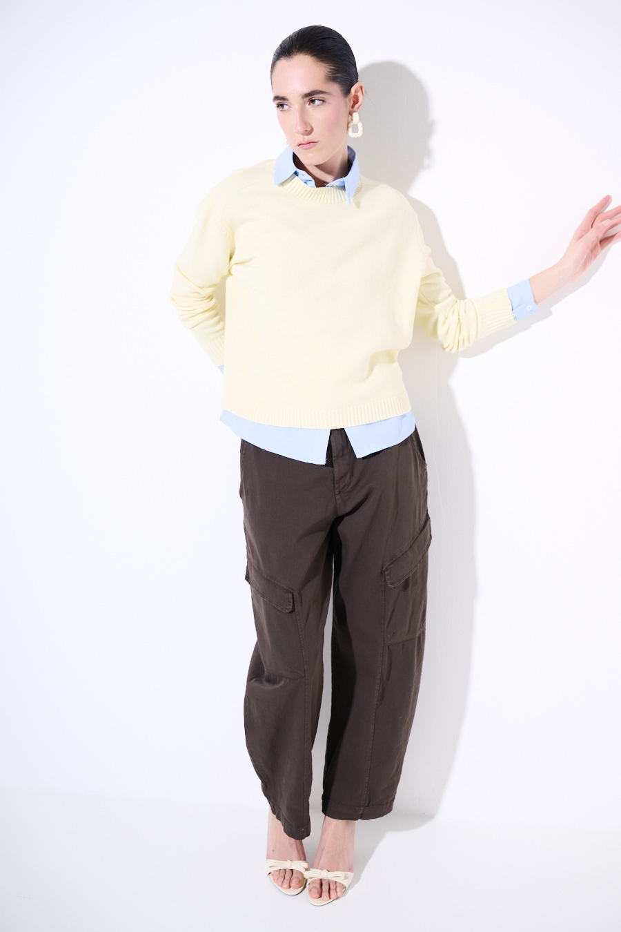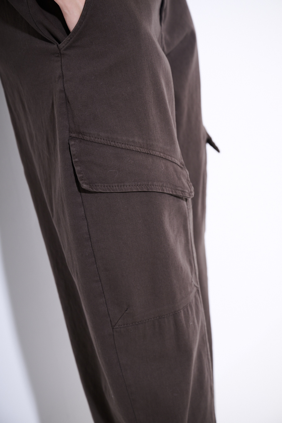 Pantalone balloon fit con ampi tasconi obliqui sul fronte con cucitura centrale. Elasticizzato sul retro in vita con cintura e chiusura con bottone e zip