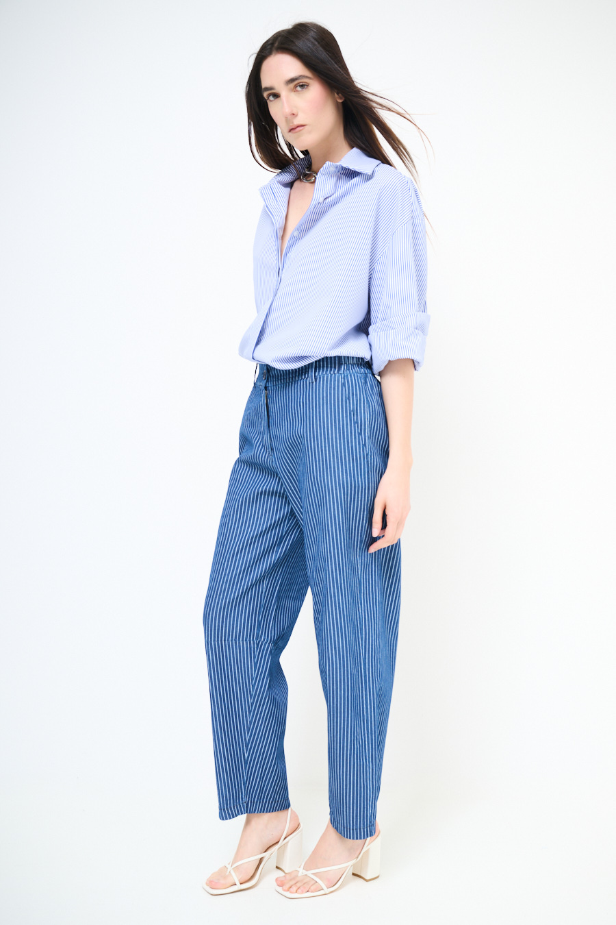 PANTA BALLOON IN CHAMBRAY A RIGHE BIANCO/BLU