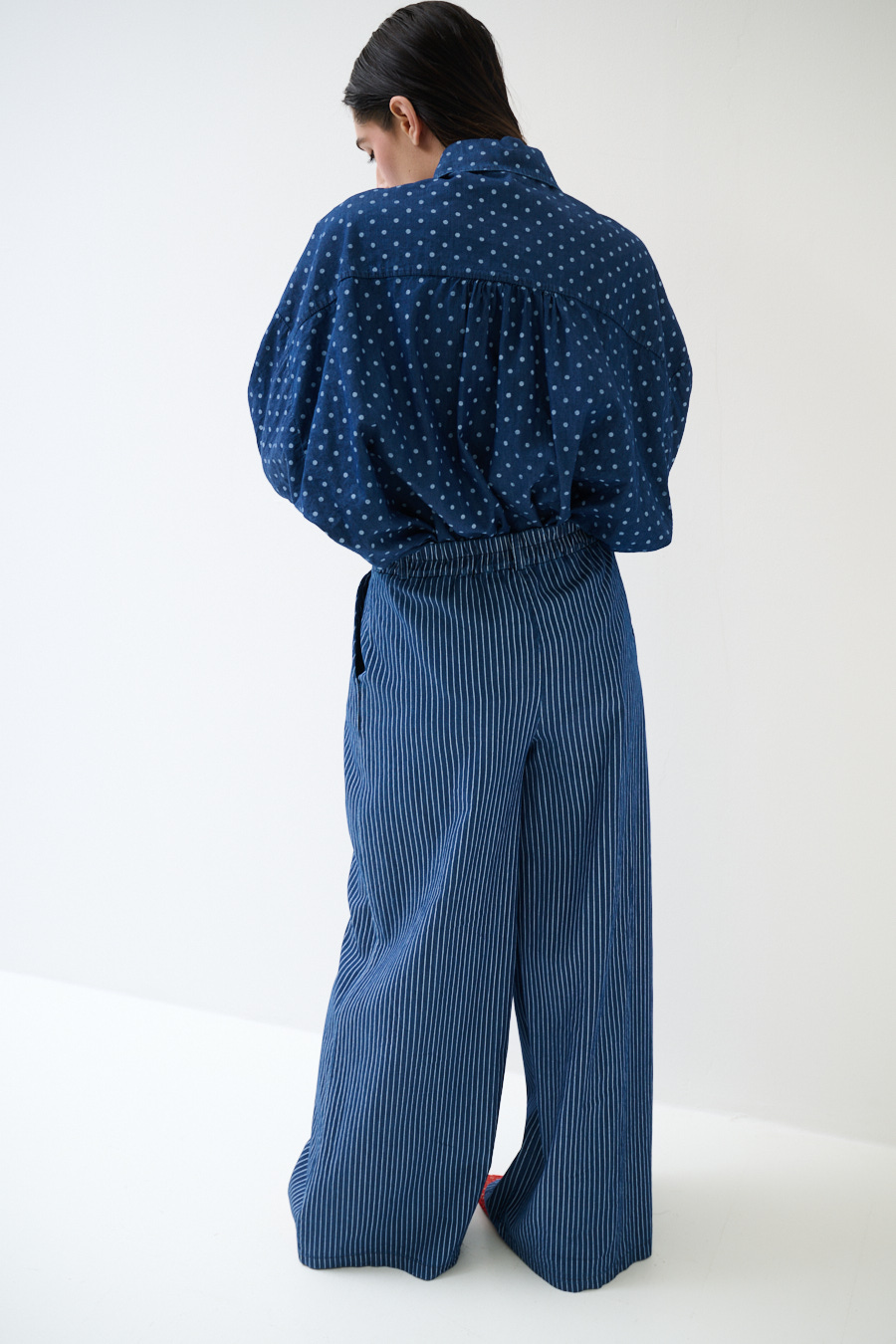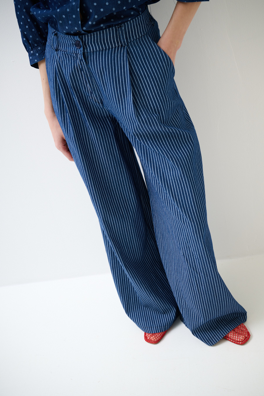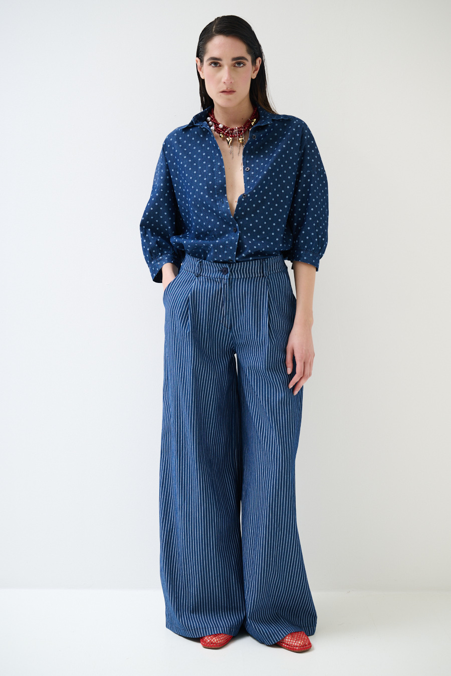 PANTA PALAZZO IN CAHMBRAY A RIGHE BIANCO/BLU