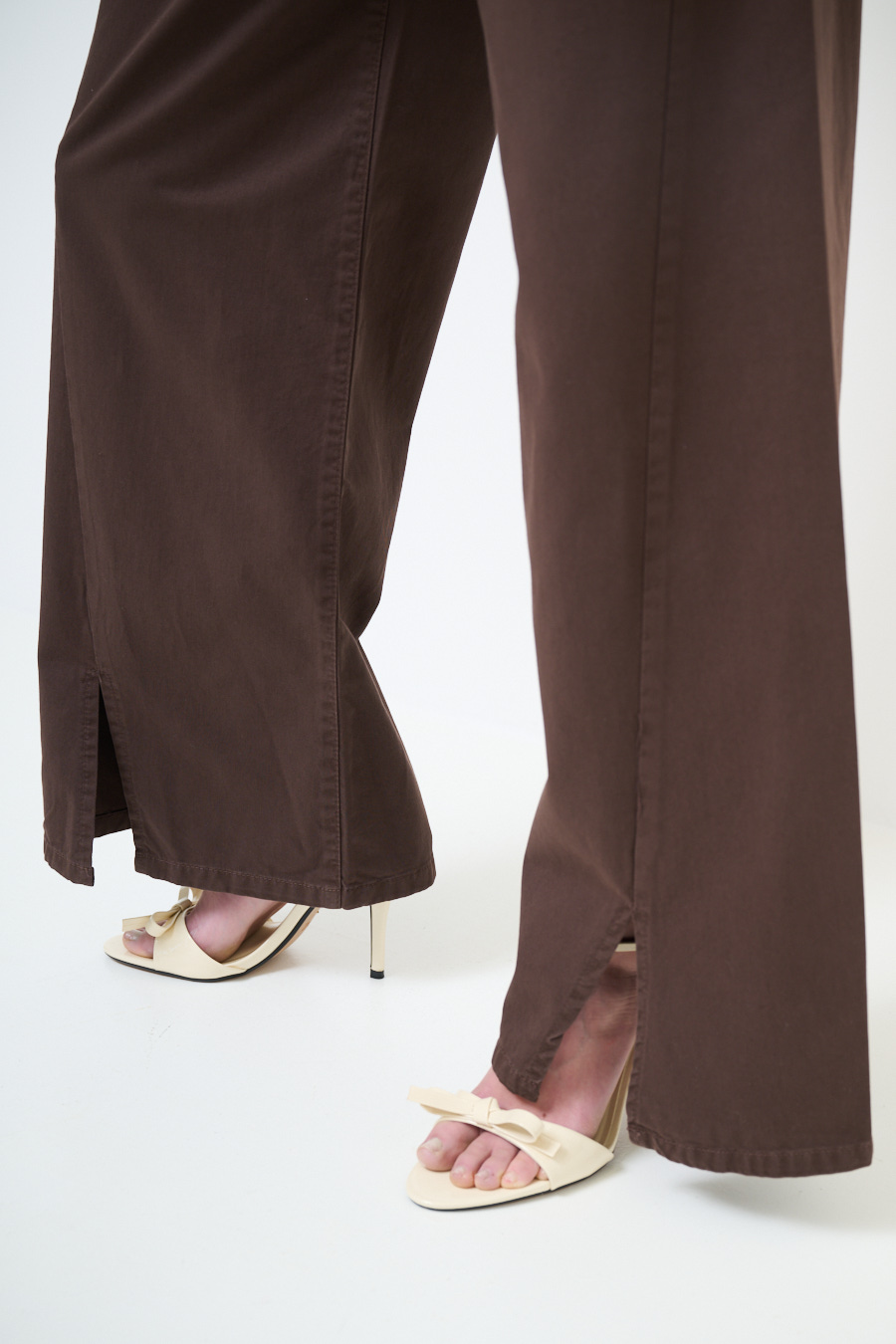 Pantalone in gabardina ampio con spacchi sul fondo e cucitura obliqua, a 5 tasche e chiusura con zip e bottone