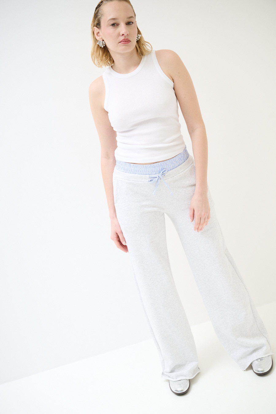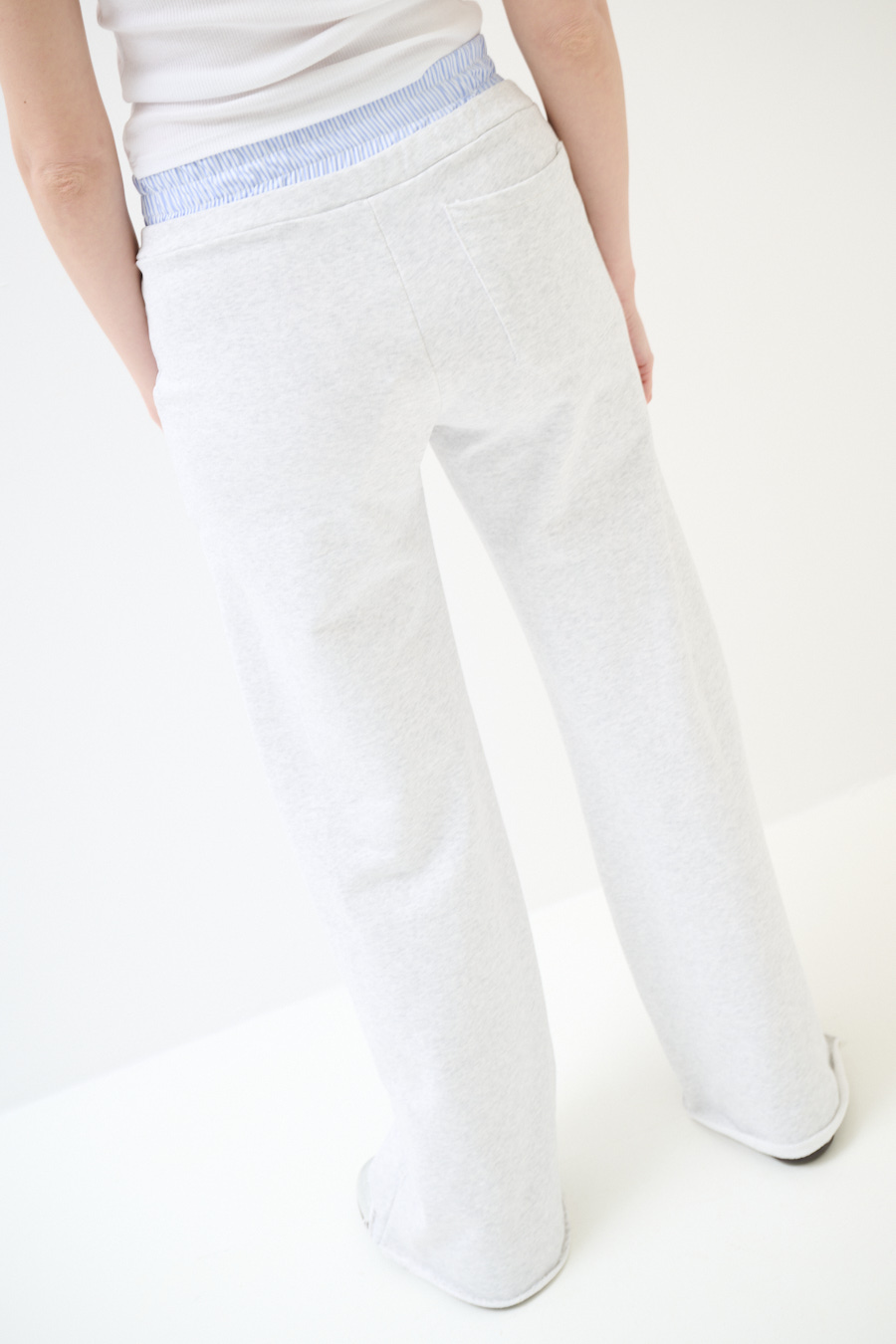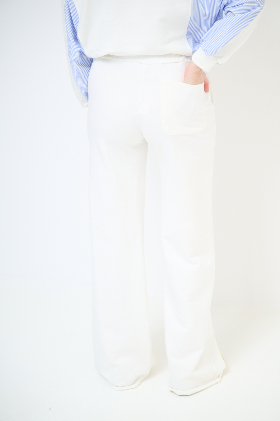 Pantalone ampio in felpa garzata con fondo a taglio vito e doppio cinturino in vita in popeline a righe elasticizzato
