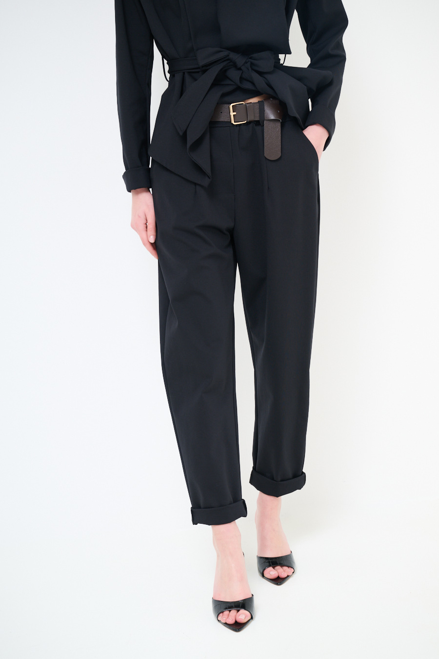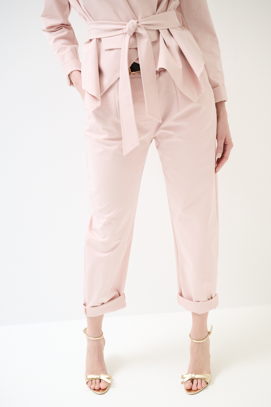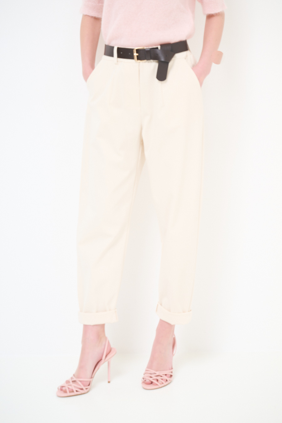 Egg-shaped Milano stitch trousers with pleats and waist belt. Zip and button closure and elasticated at the back