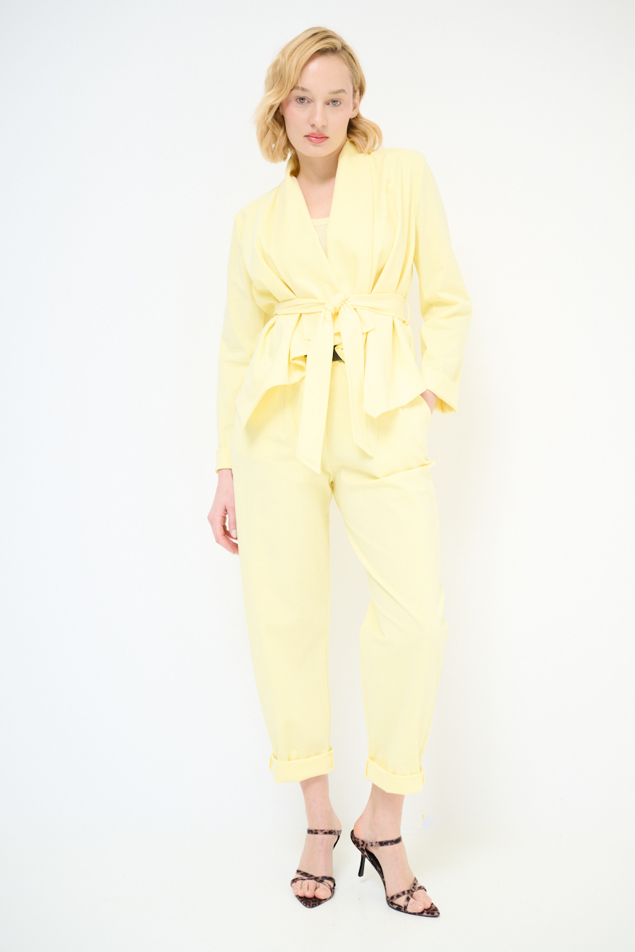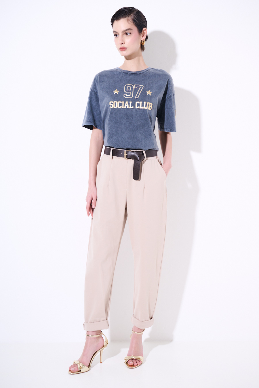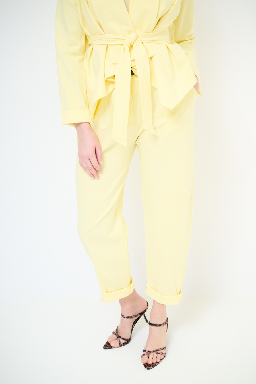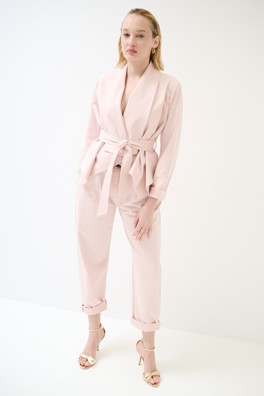 Egg-shaped Milano stitch trousers with pleats and waist belt. Zip and button closure and elasticated at the back