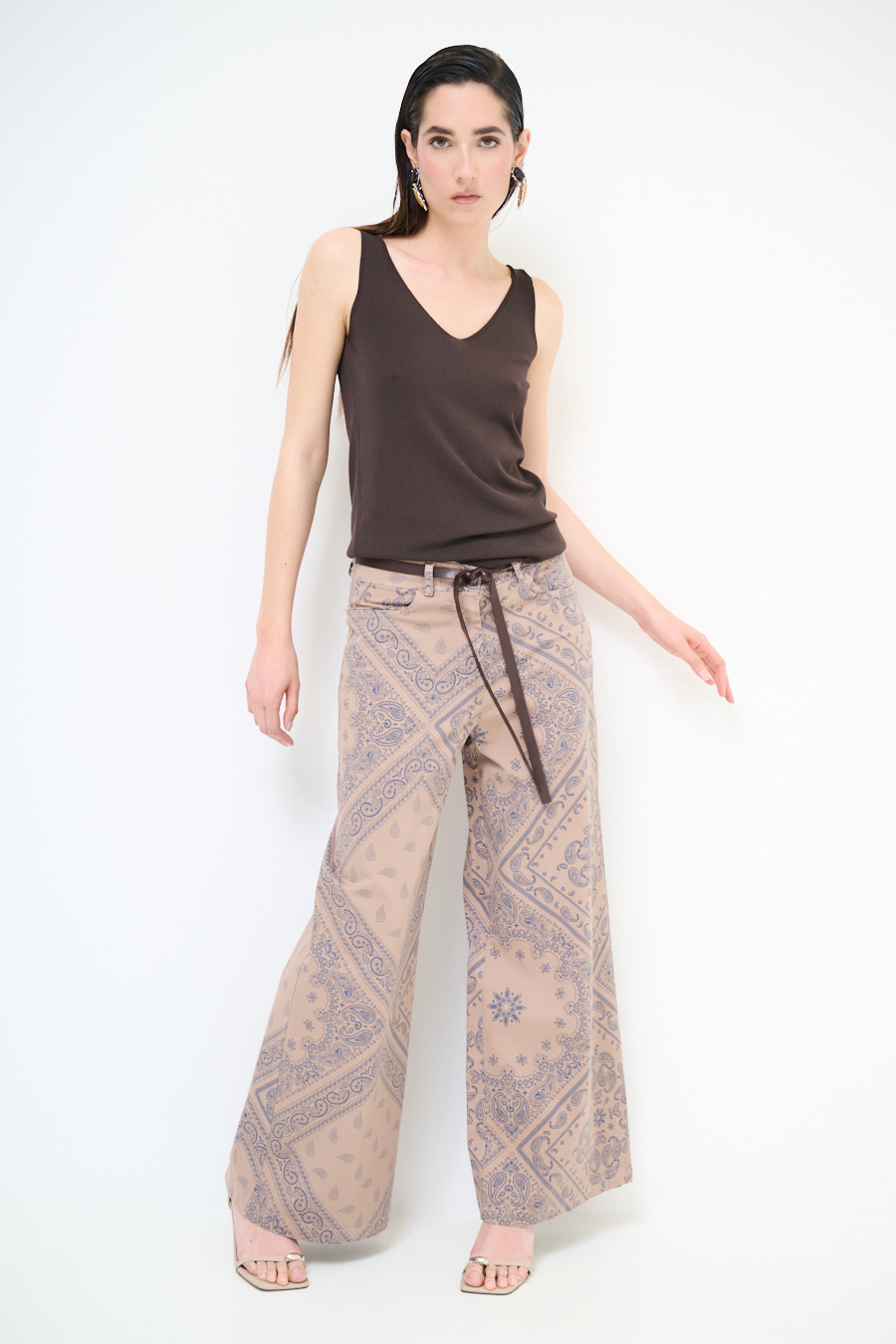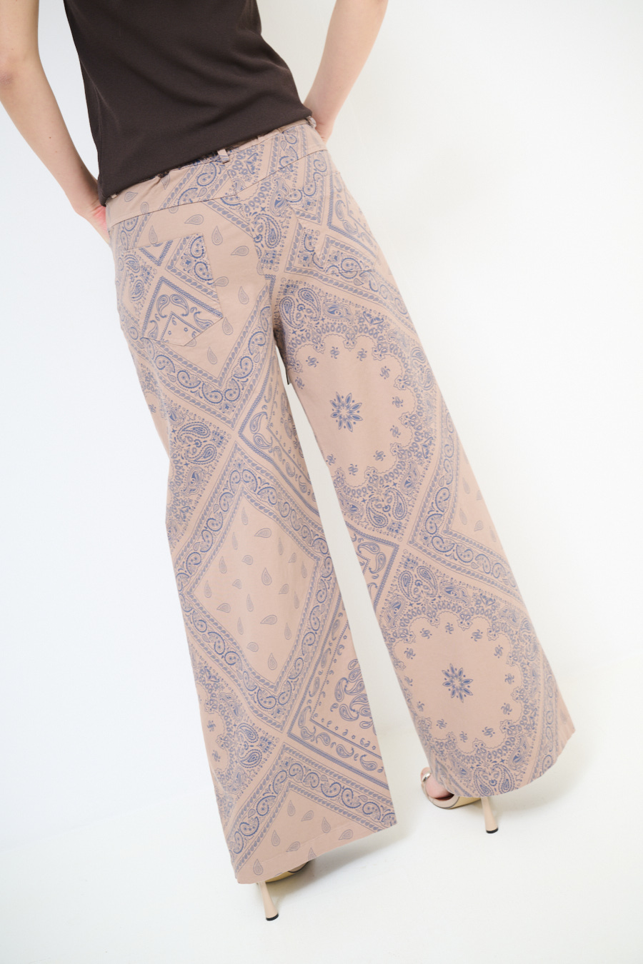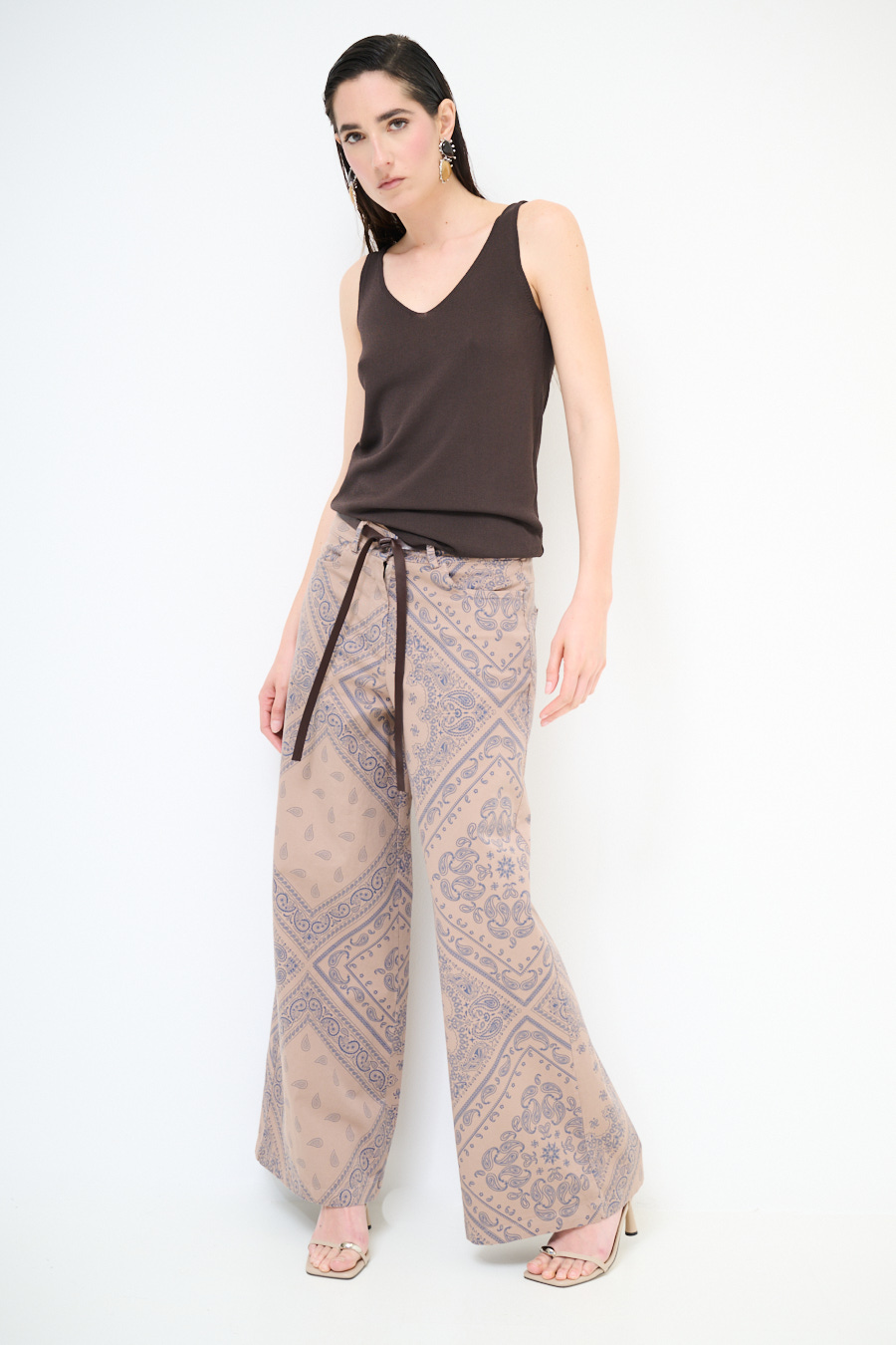 Pantalone a palazzo in gabardina leggera con stampa bandana, elasticizzato sul retro e con cintura