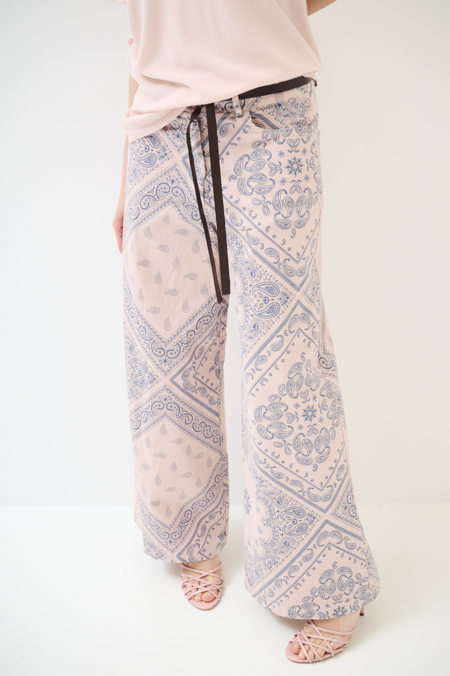 Pantalone a palazzo in gabardina leggera con stampa bandana, elasticizzato sul retro e con cintura