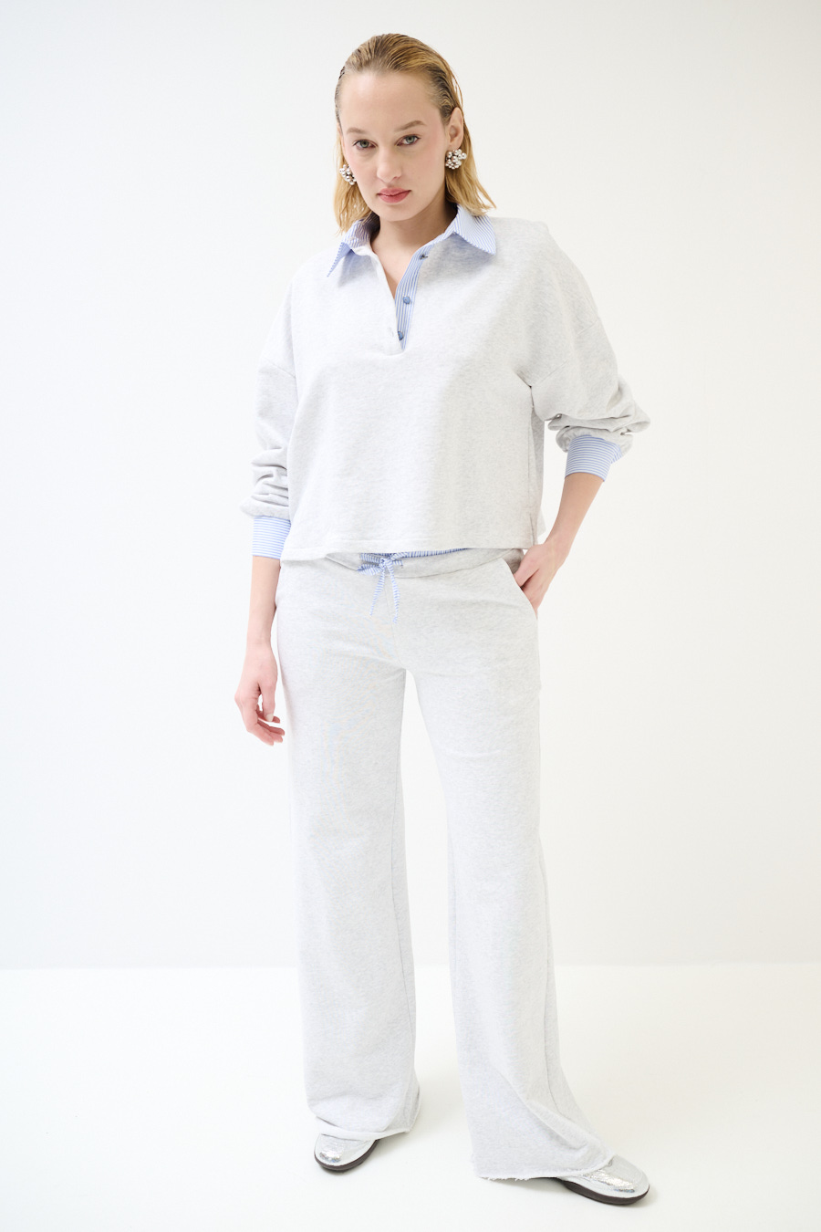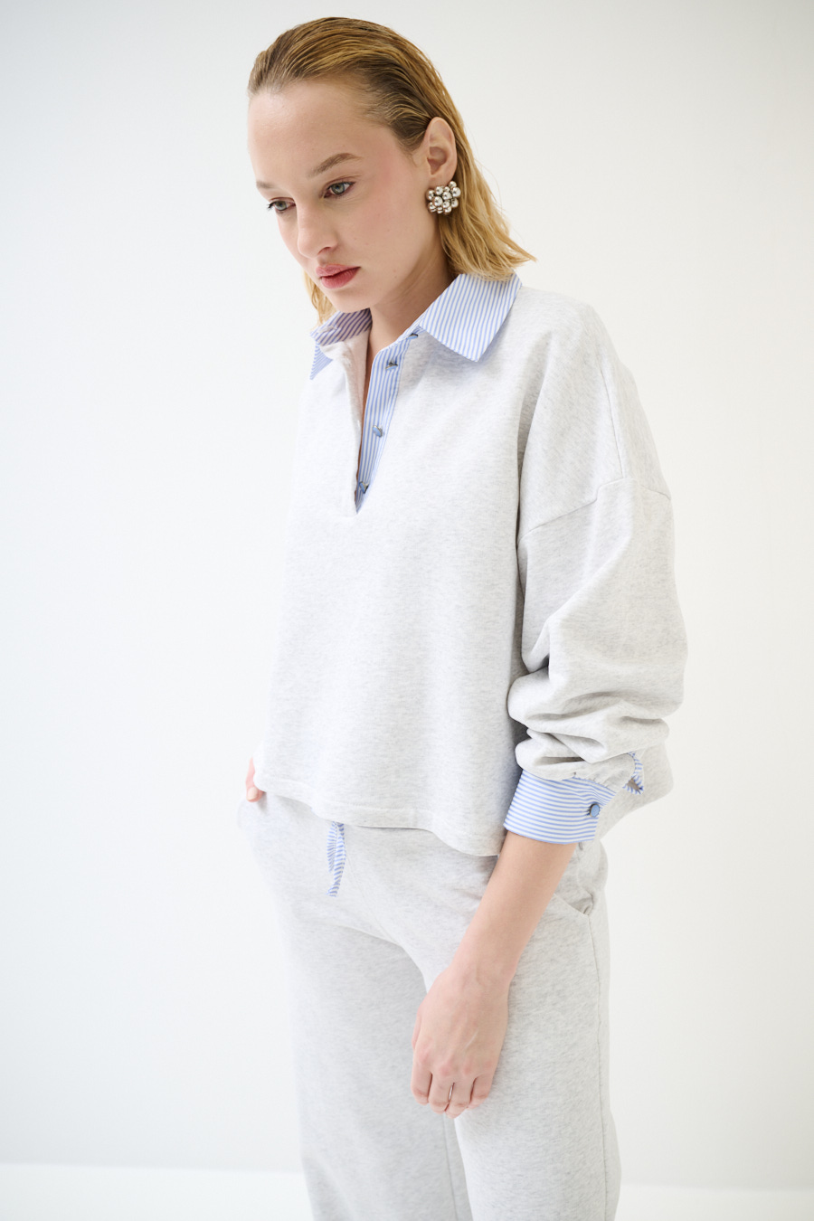 POLO FELPA CON COLLO E POLSO RIGATO POPELINE GRIGIO CHIARO