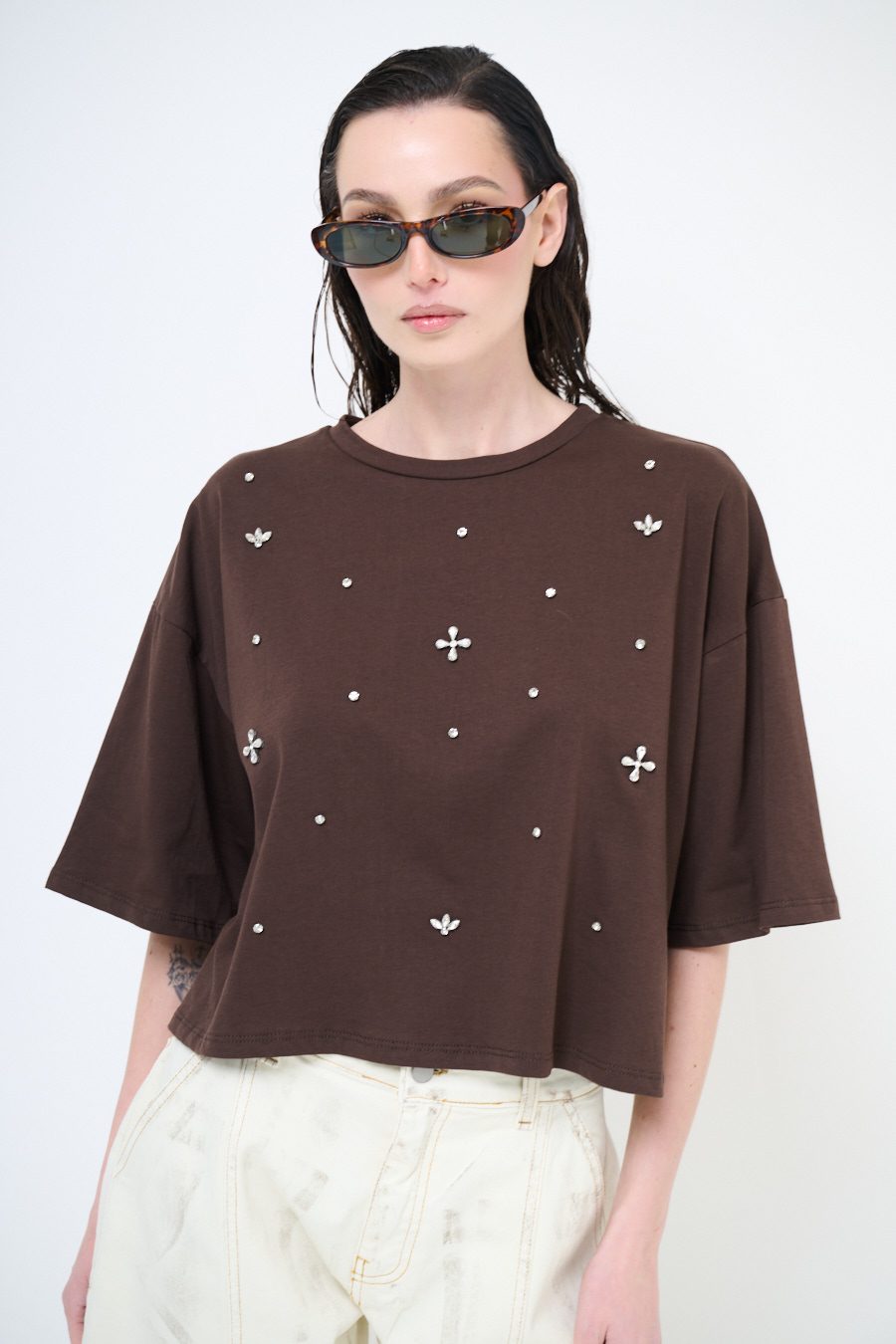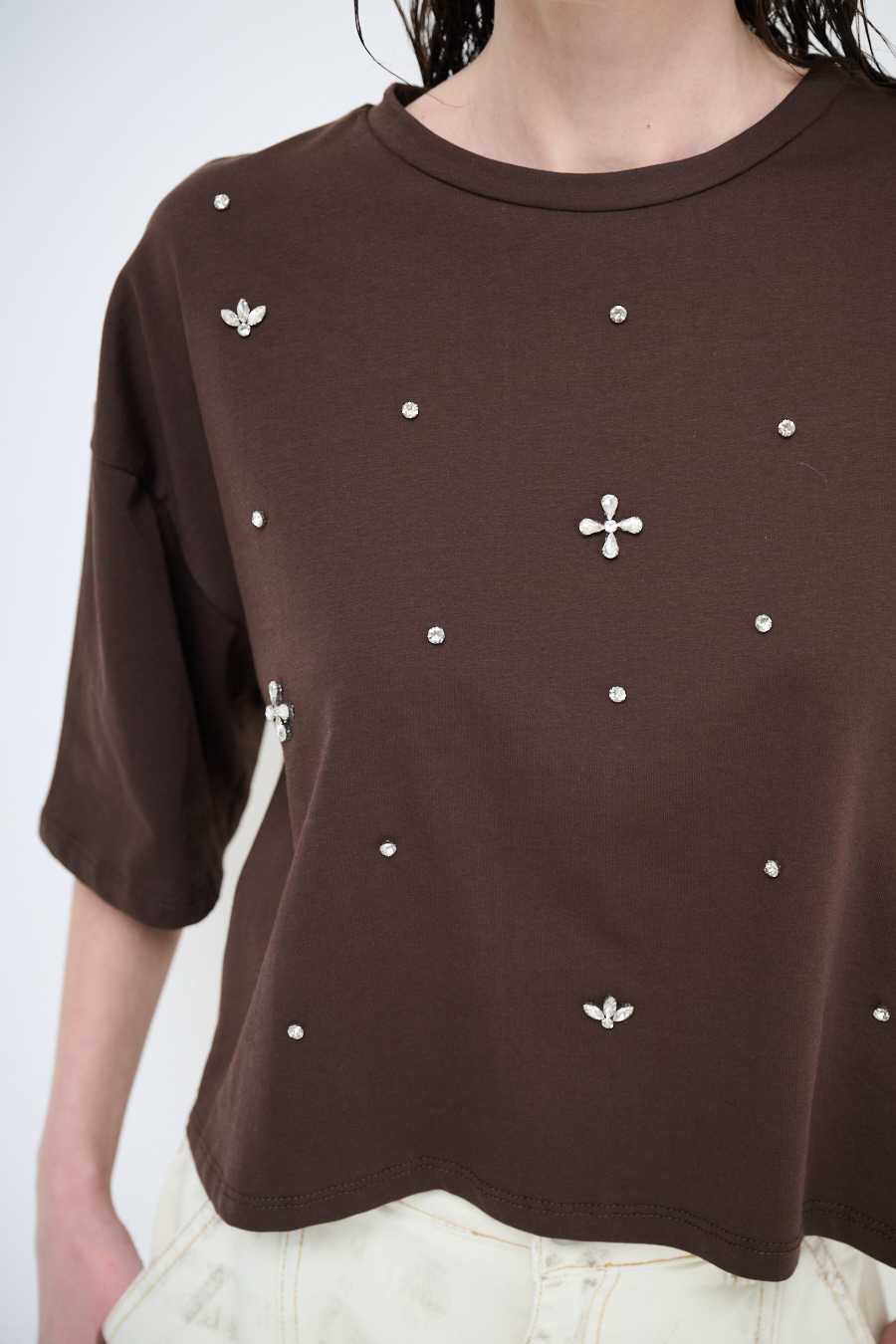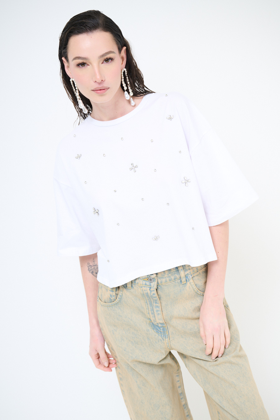 Basic crew neck crop T-shirt with jeweled bezel appliqué on the front