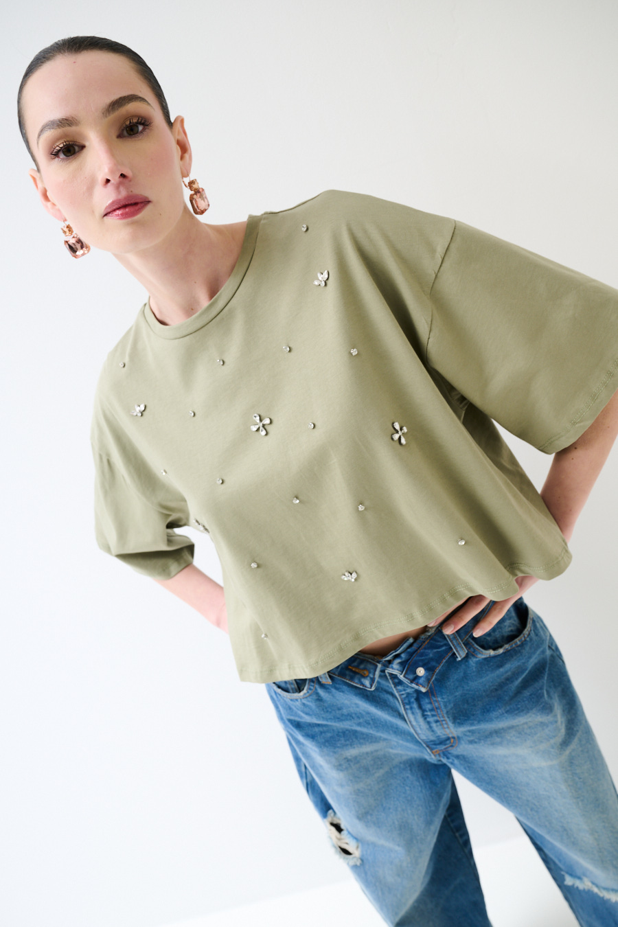 T-SHIRT CON APPLICAZIONE CASTONI SALVIA