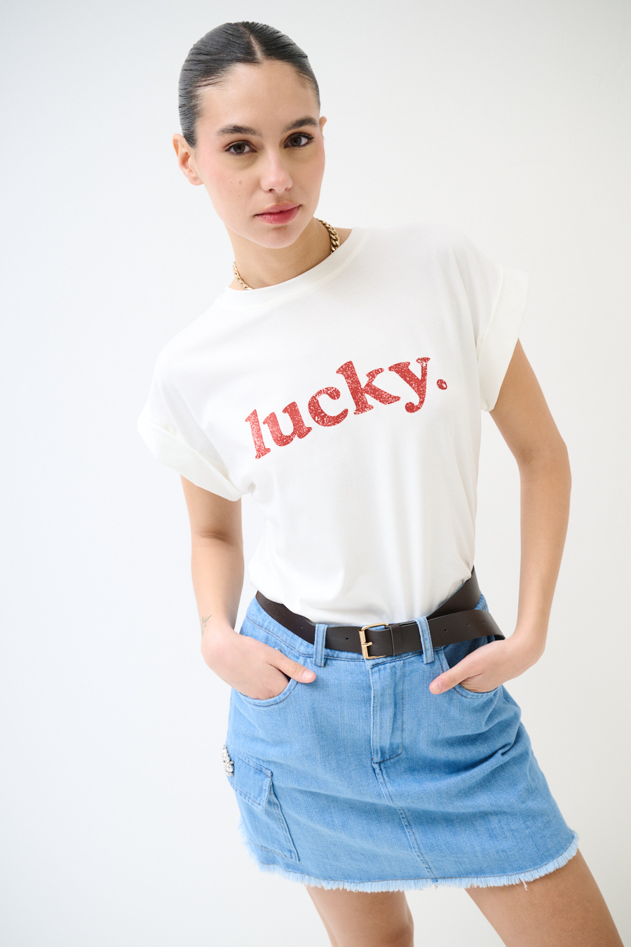 T-SHIRT CON STAMPA LUCKY EFFETTO VINTAGE BIANCO