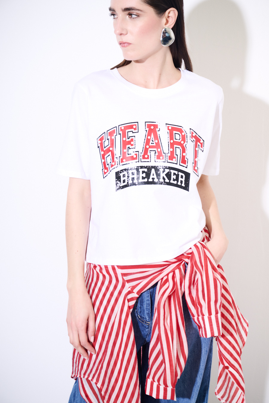 T-shirt crop basic con stampa 'heart breaker' con perle