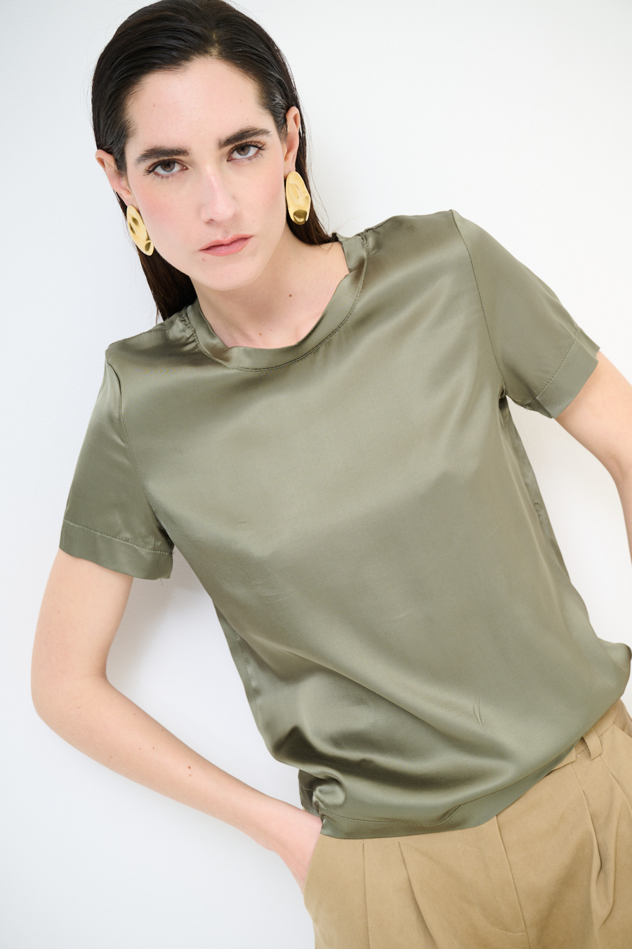 T-shirt in raso di viscosa paricollo a mezza manica