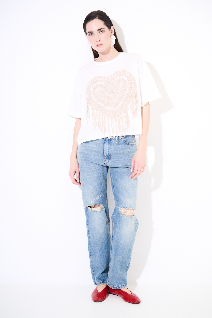 T-shirt crop boxy fit, con applicazione in macramè sul fronte