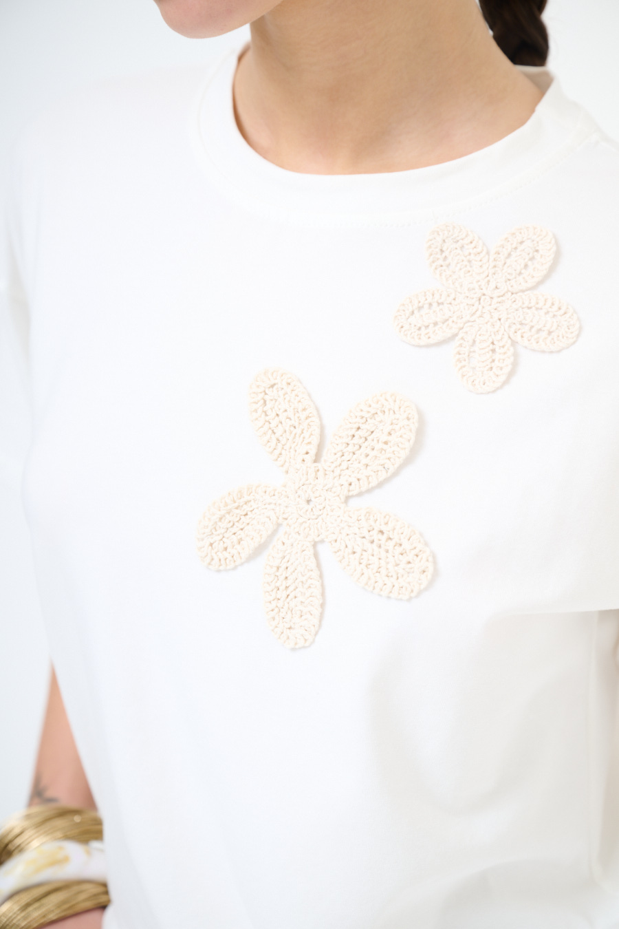 T-SHIRT OVER CON FIORI IN MACRAME BIANCO