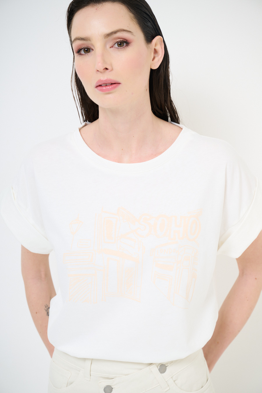 T-shirt boxy fit con stampa 'Soho' vintage e maniche con risvolto