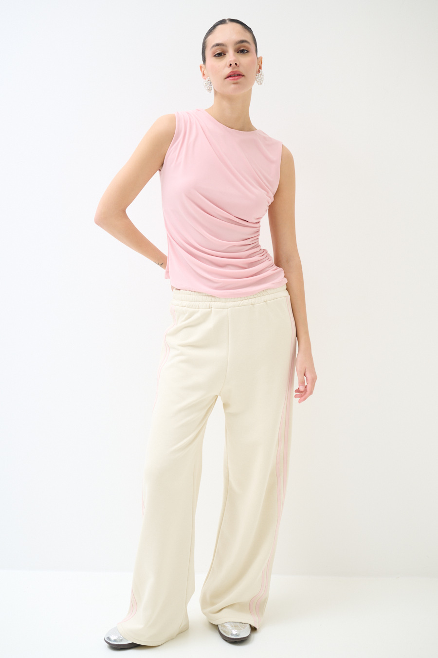 Top smanicato in tessuto stretch con riprese laterali