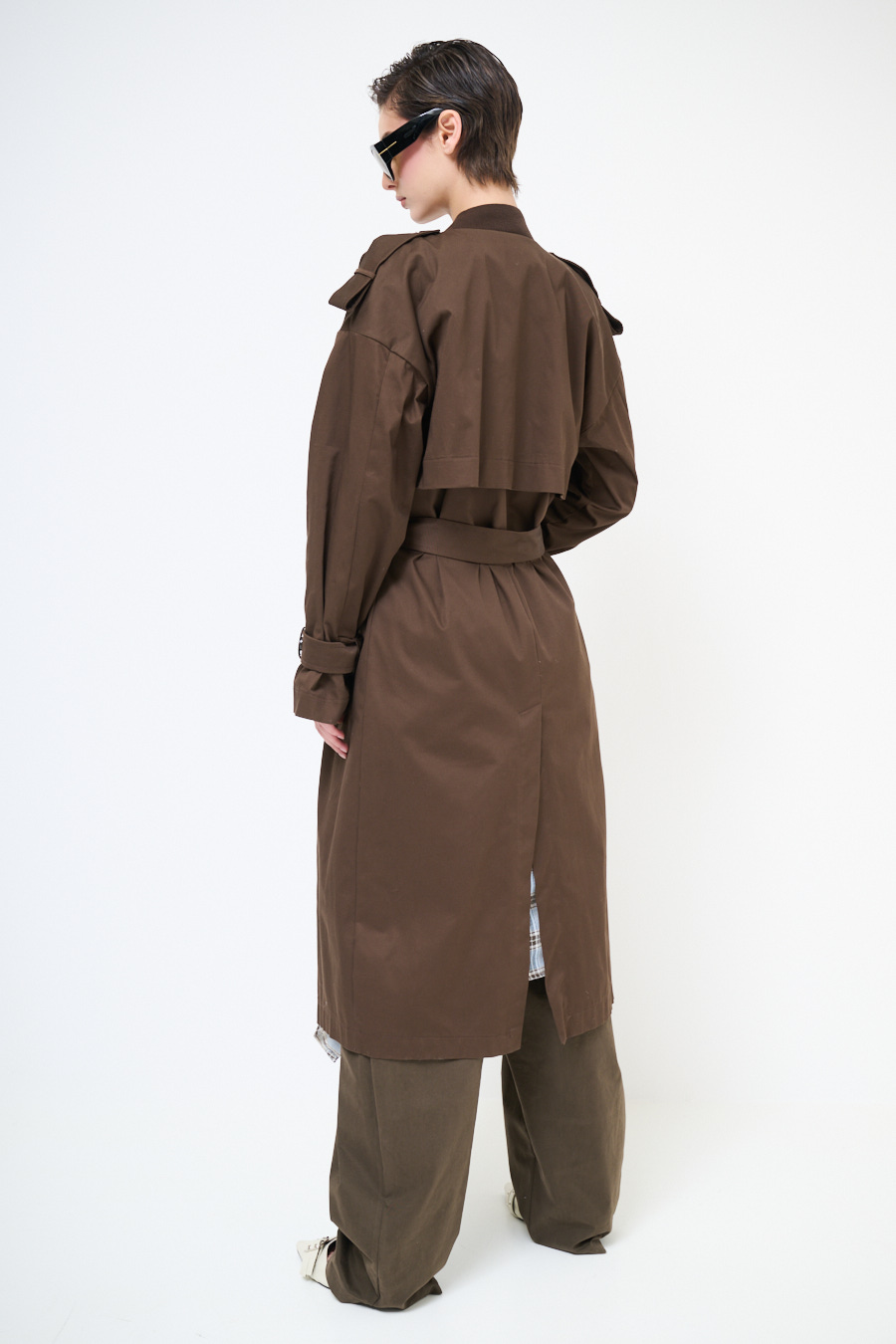 Trench oversize lungo a doppio petto e con zip, spalla calata e cintura in vita. Con interno oxford sulle spalle e ampio spacco sul retro