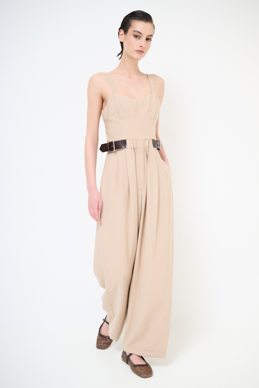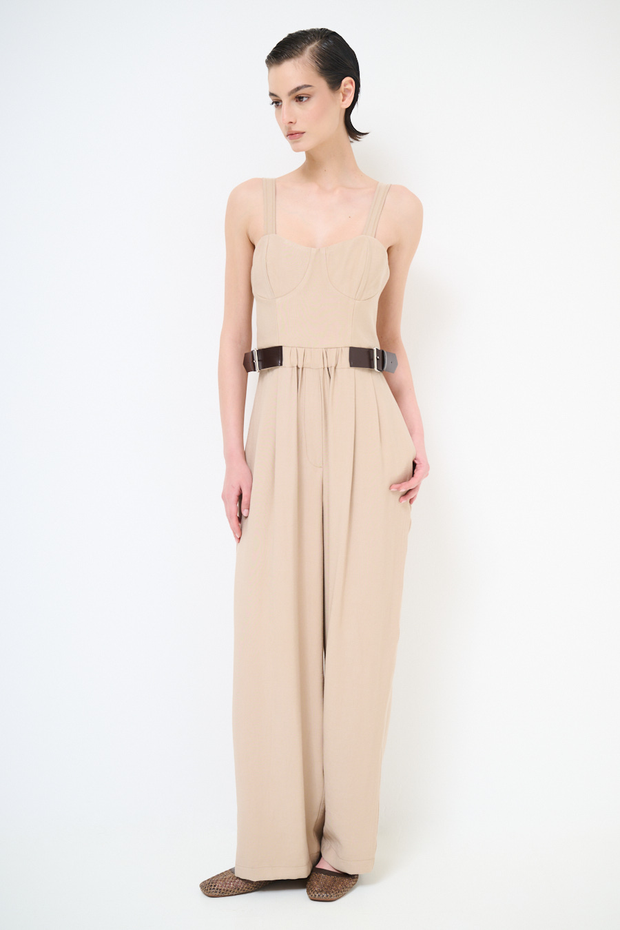 Tuta a palazzo con gamba morbida, con bretelle e finto bustino, arricciato in vita e con cintura