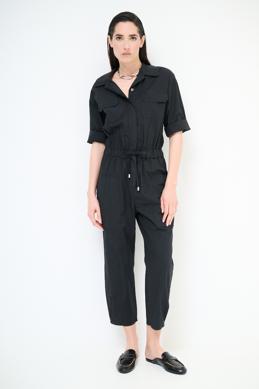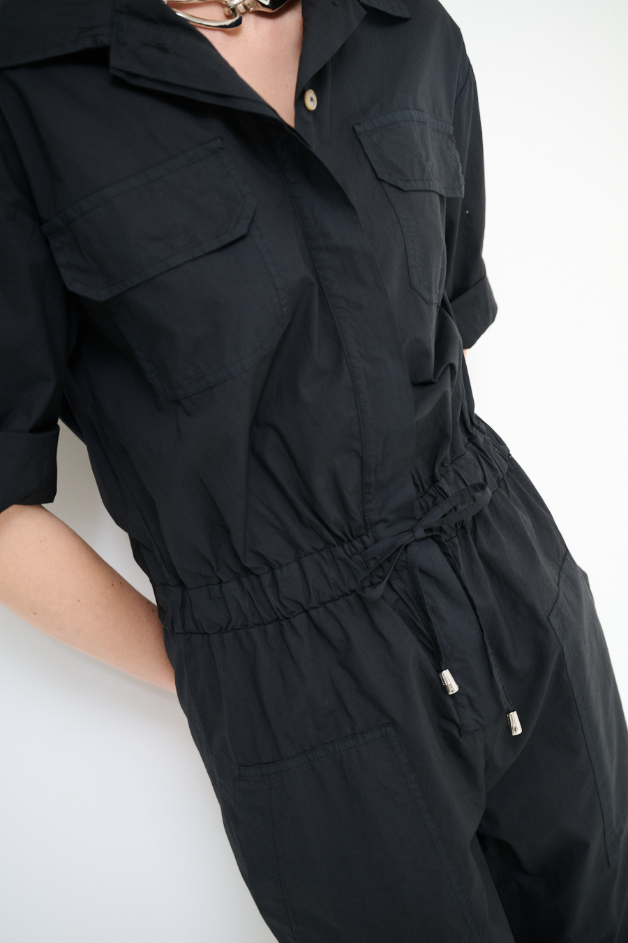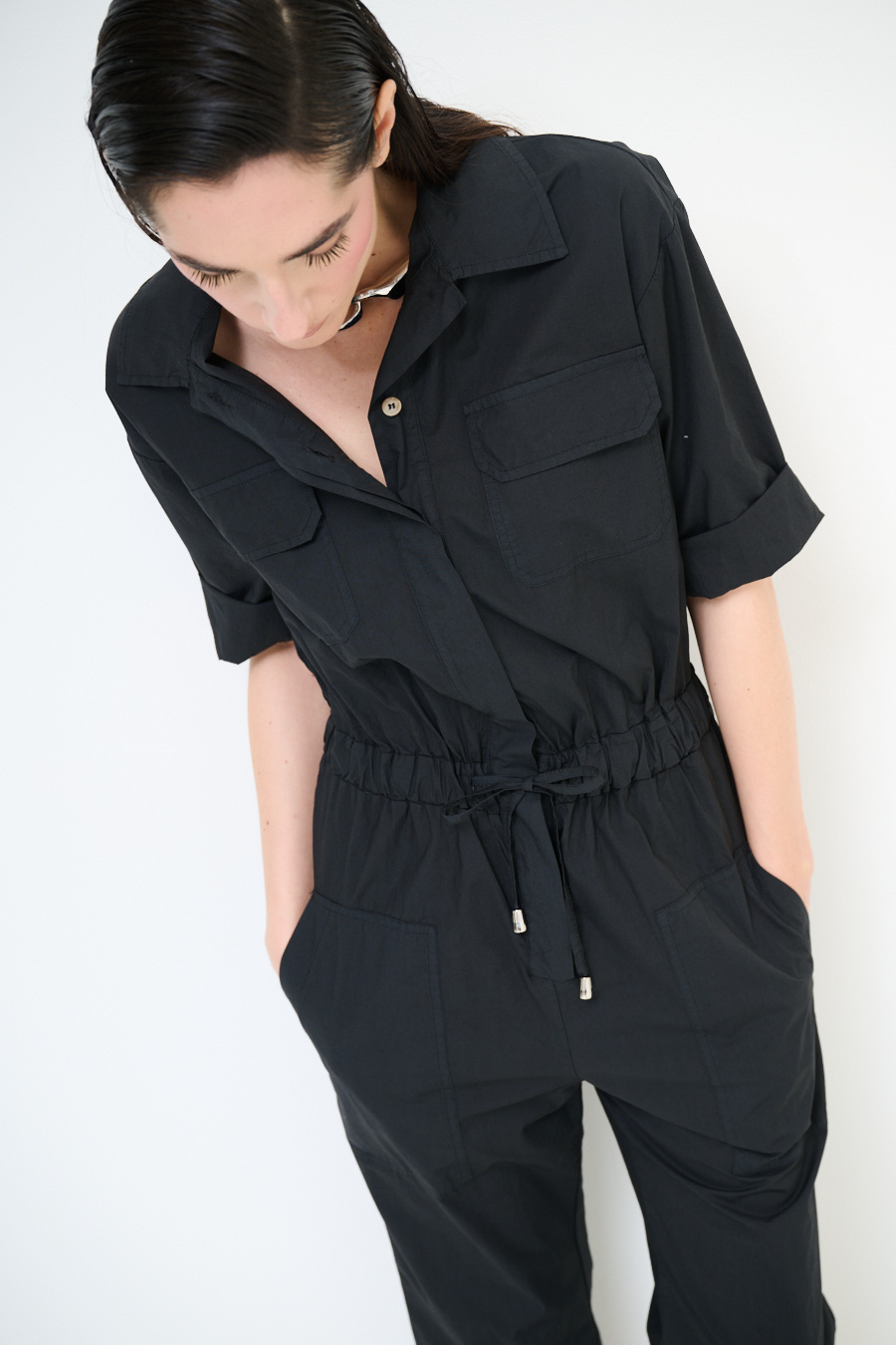 Tuta intera in tela paracadute leggera con ampie tasche sul fronte, con manica corta e coulisse in vita