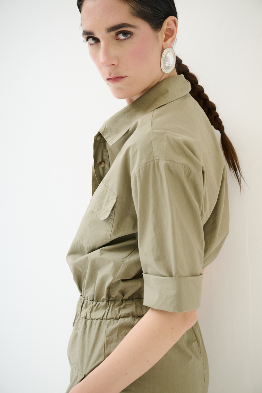 Tuta intera in tela paracadute leggera con ampie tasche sul fronte, con manica corta e coulisse in vita
